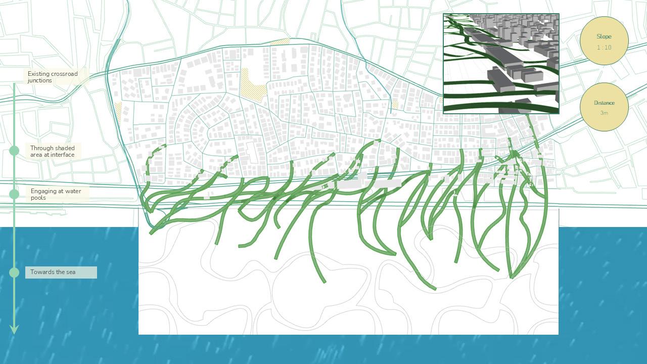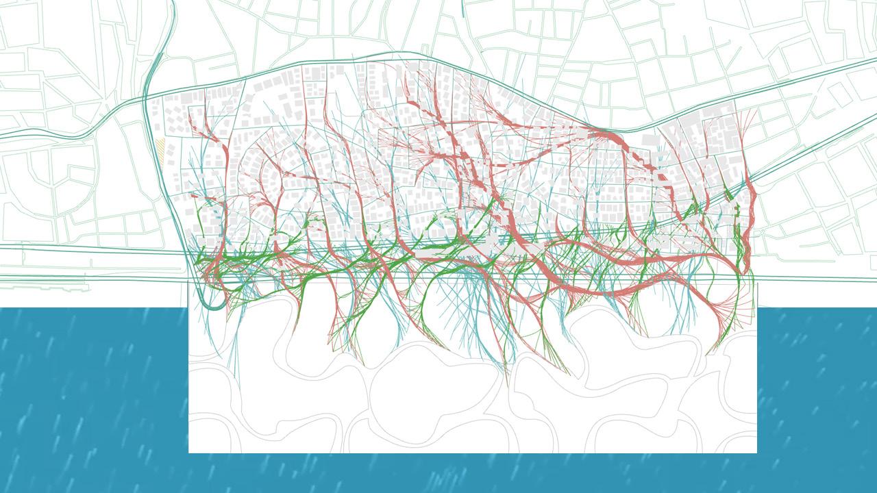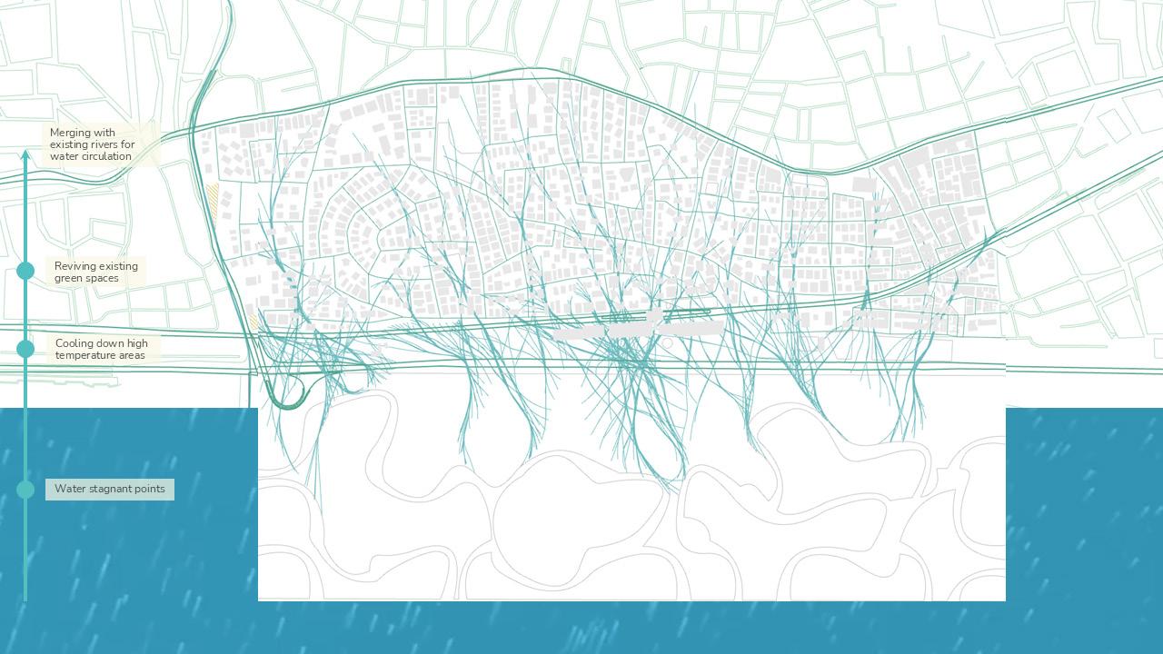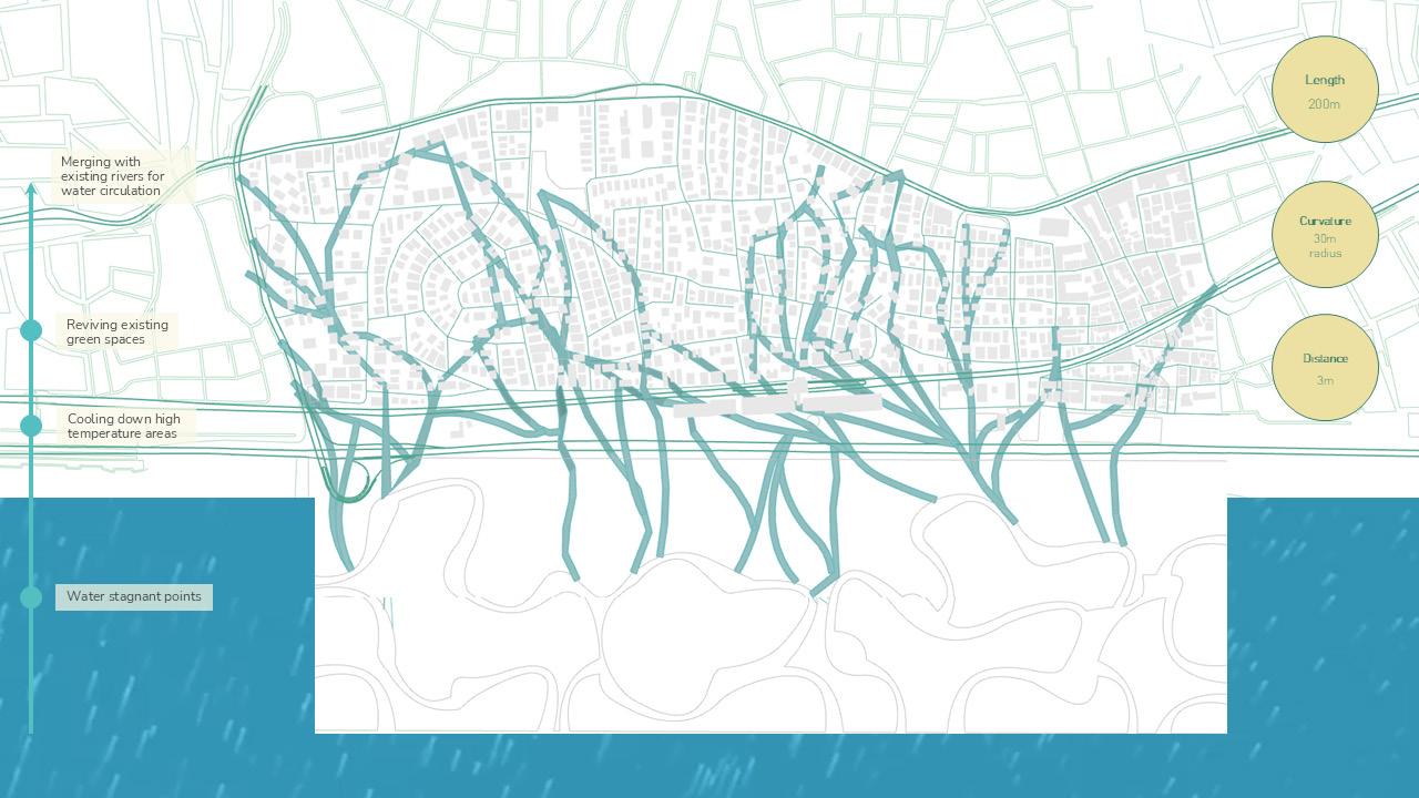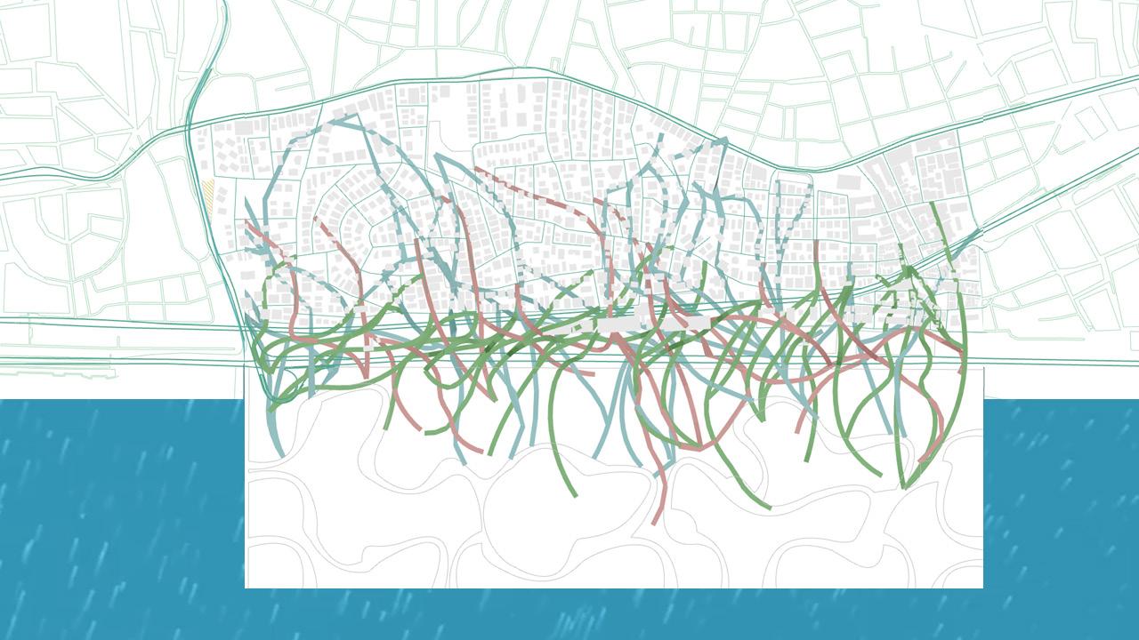 From this, an integrated network emerges where water, pedestrian and mobility systems are collectively designed to restore permeability, soften infrastructural barriers and enable people to reconnect with the coast while re-establishing ecological flows within the city. These networks do not function merely as connectors but actively respond to their surrounding environment and engage with existing functions within the urban fabric. As water re-enters the city and people move towards the coast, their converging movements weave through urban voids and heat-affected areas, forming a unified system where environmental processes and public life shape a continuous sequence of spatial spaces.