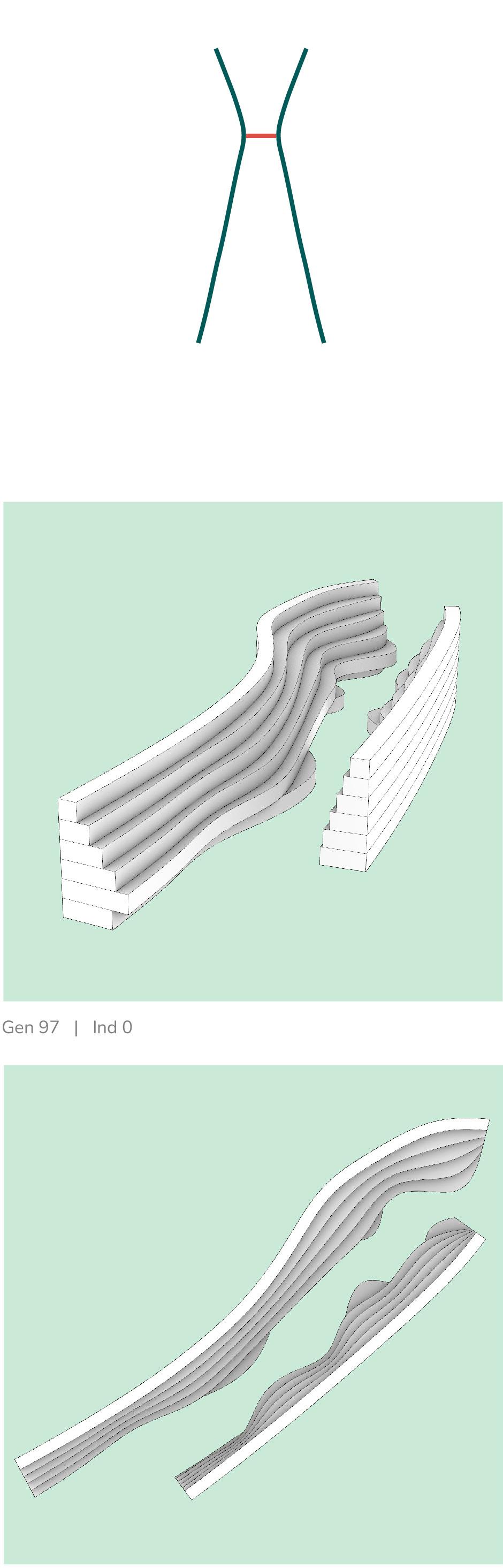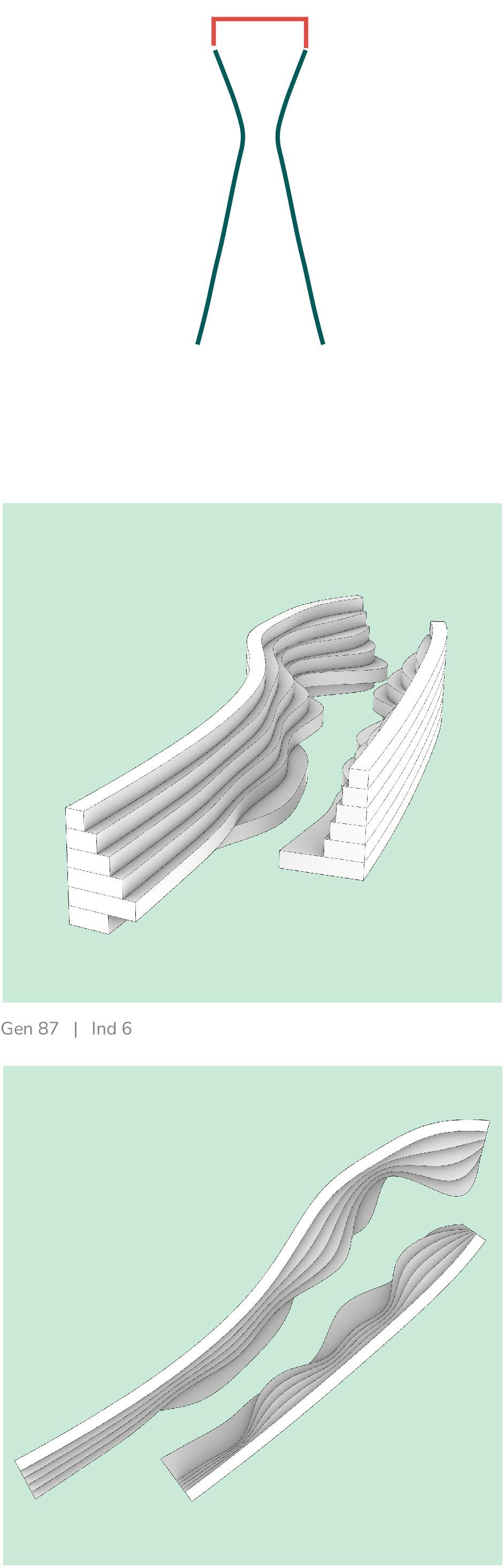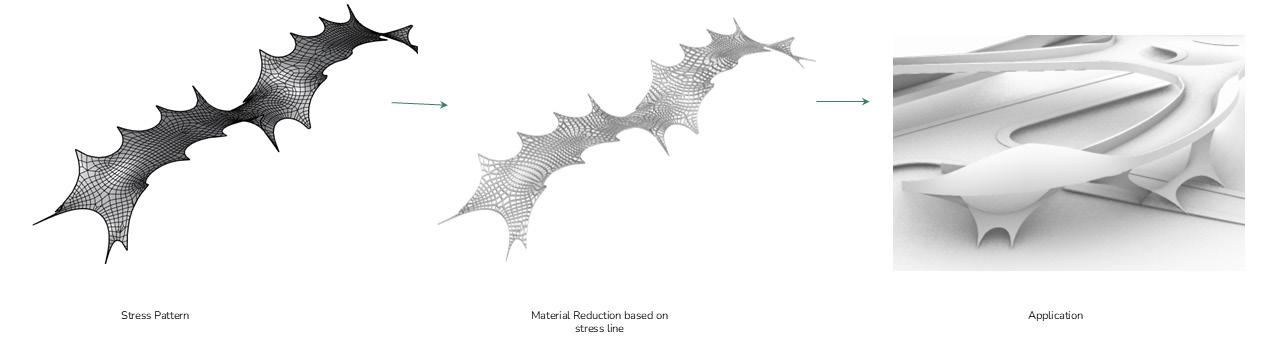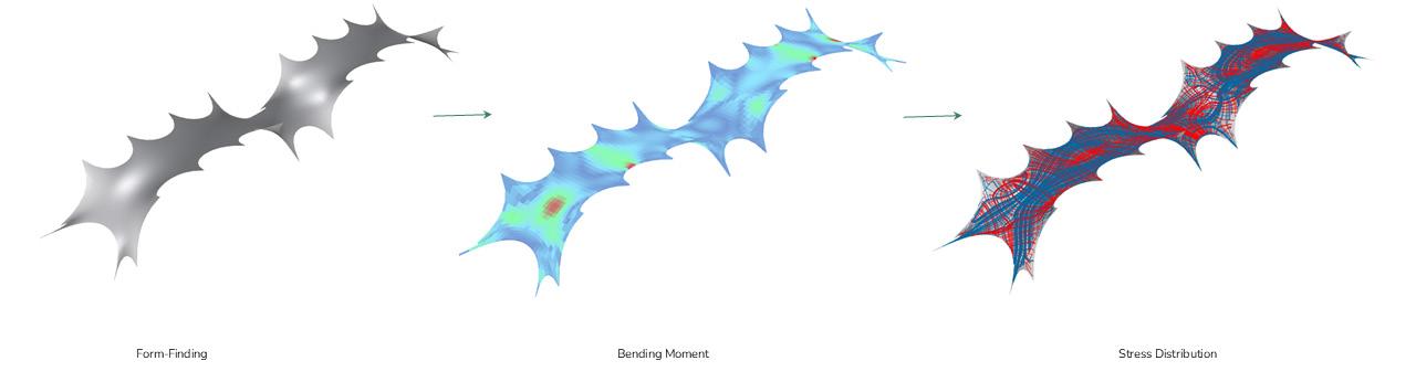 This chapter transitions the project from spatial articulation to structural feasibility. Geometries derived from experiential and movement logics are now validated through structural simulations. Form-finding defines the initial surface, which is tested against bending behaviour and stress distribution to identify areas of structural demand. Material is applied selectively to these zones, reducing excess and ensuring buildable efficiency.