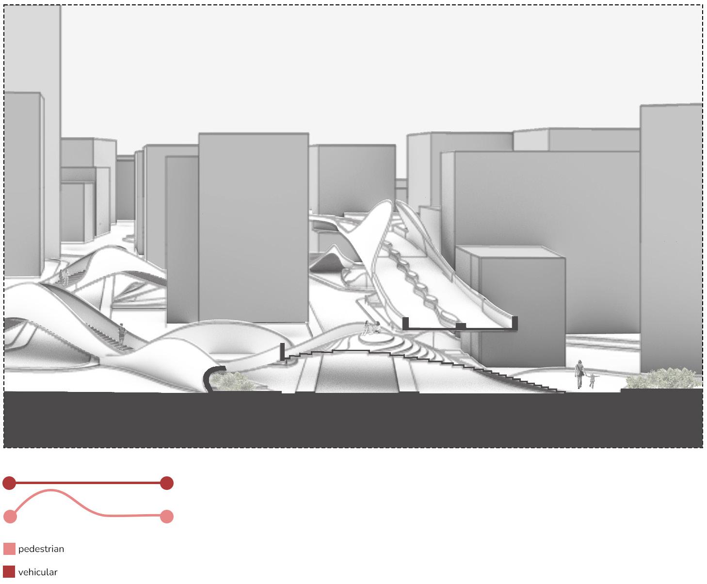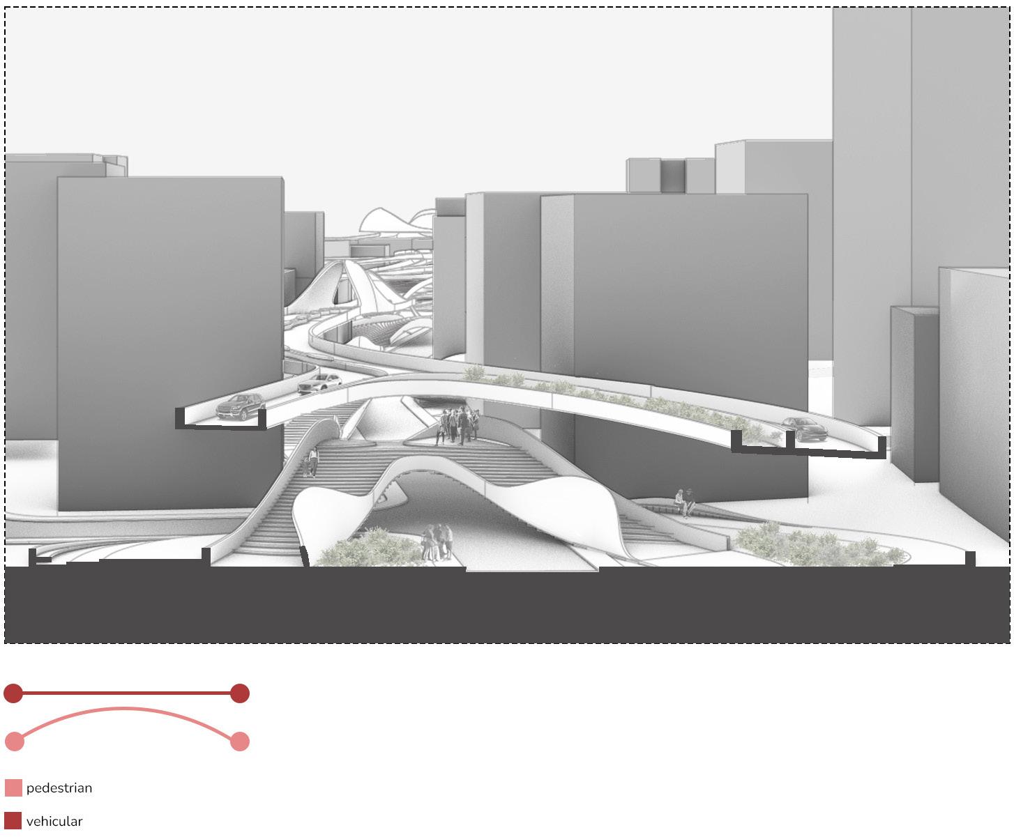 In the urban zone, vehicular roads remain at grade but are redefined through architectural thickening. Roads are integrated with overhead shading canopies that serve dual functions: maintaining traffic continuity and creating shaded, structured crossings for pedestrians. This integration supports thermal comfort and ensures clear separation between pedestrian and vehicular domains at intersections and nodes.