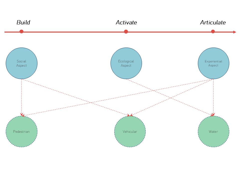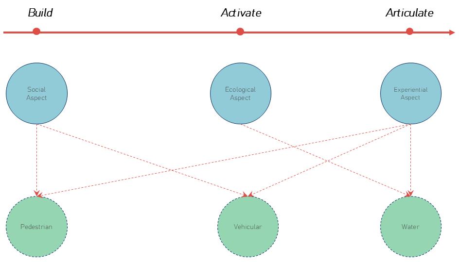 The vehicular system is addressed as an infrastructural layer that is reorganised to support the spatial and experiential priorities established by the water and pedestrian layers. Rather than functioning as a dominant surface element, the vehicular network is restructured across zones to reduce environmental disruption and spatial fragmentation. This allows the corridor to maintain continuity in human movement and environmental integration.