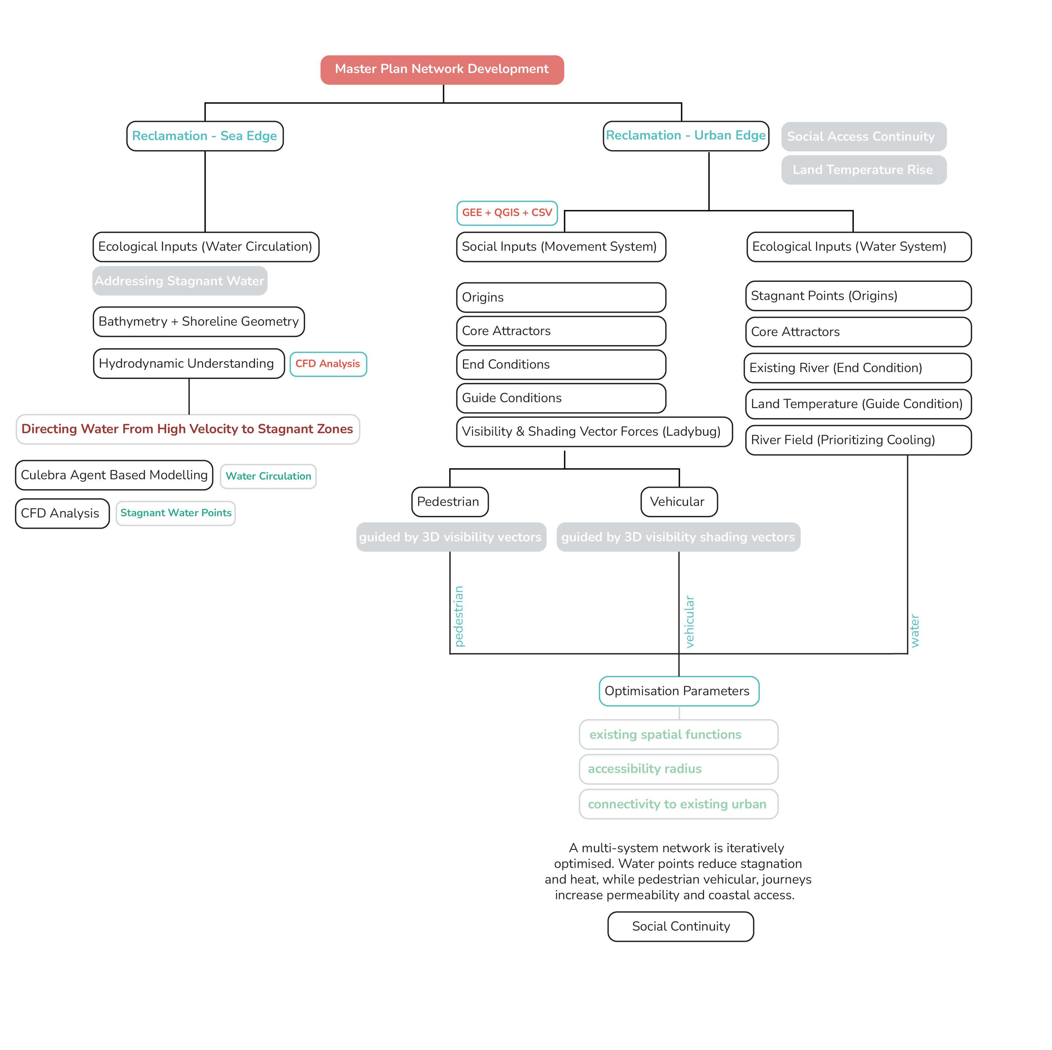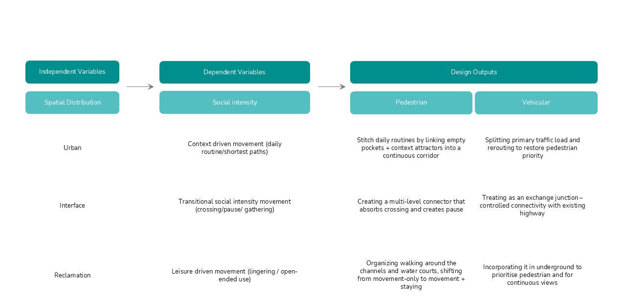 These relationships reveal systemic interdependence. Water moderates climate, informing pedestrian comfort and spatial use. Vehicular flows are redirected to minimise disruption. Together, these systems produce a continuous and responsive environment grounded in environmental logic and user needs.
