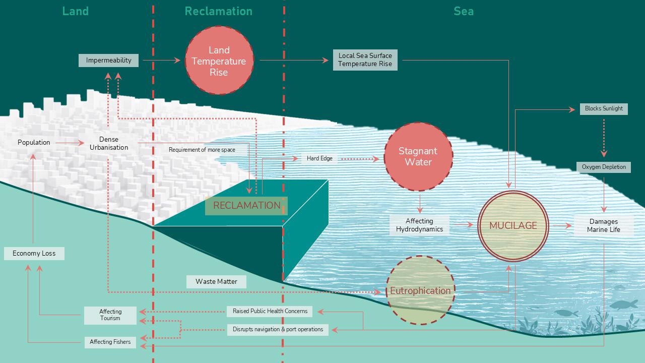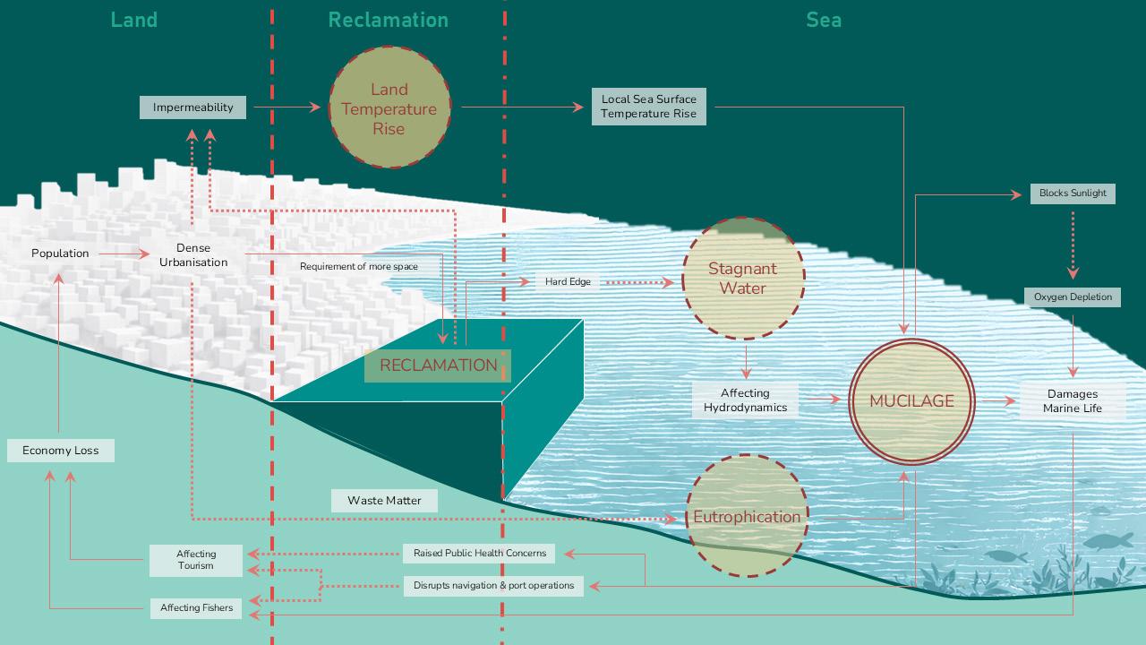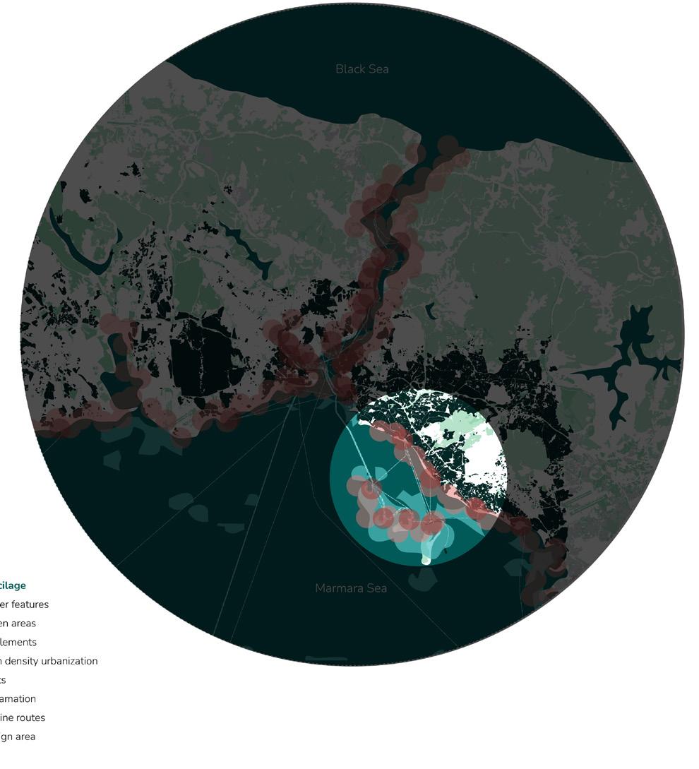 Dense urbanisation and coastal infrastructure have hardened the land–sea threshold into an impermeable boundary. What was once shaped by natural coastal flows has been transformed by infrastructure-led expansion that buries water streams, increases building density and leaves open spaces trapped and isolated. The hard reclaimed surface restricts water movement and alters sea hydrodynamics, deepening eutrophication and mucilage formation in the Sea of Marmara, while the growing urban density and impermeable reclaimed edge intensify land temperatures across the city, placing further environmental stress on the urban fabric. In addition, highways and rail lines disrupt direct access to the coastline, further distancing the city from the sea. The project rebuilds the urban–coastal gradient by softening the rigid reclaimed edge and introducing permeability across the urban–reclamation boundary, forming a coherent system of environmental and civic transitions. Building on earlier ecological design strategies, in which marine flow channels were used to restore circulation and water quality, the proposal extends this logic inland to mitigate growing heat temperature, uncover buried interfaces and reactivate a continuous spine that reconnects water, public spaces, pathways, green areas and the coastal edge.