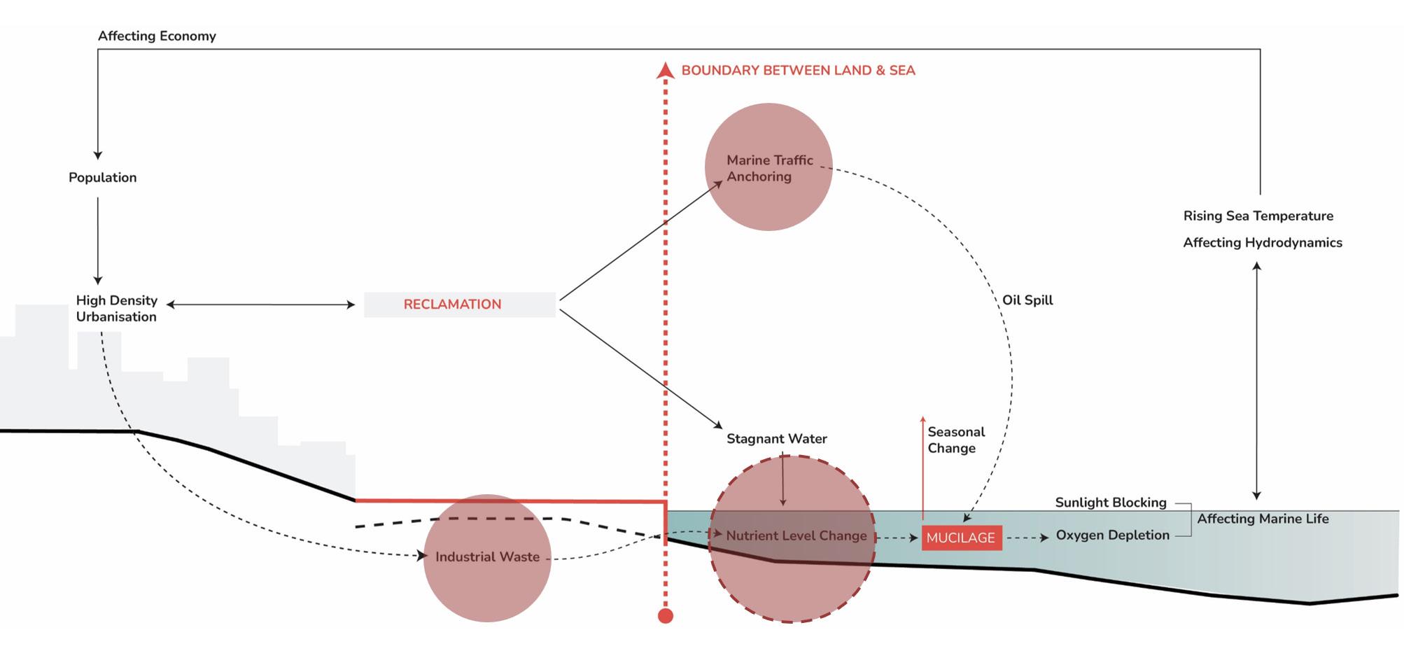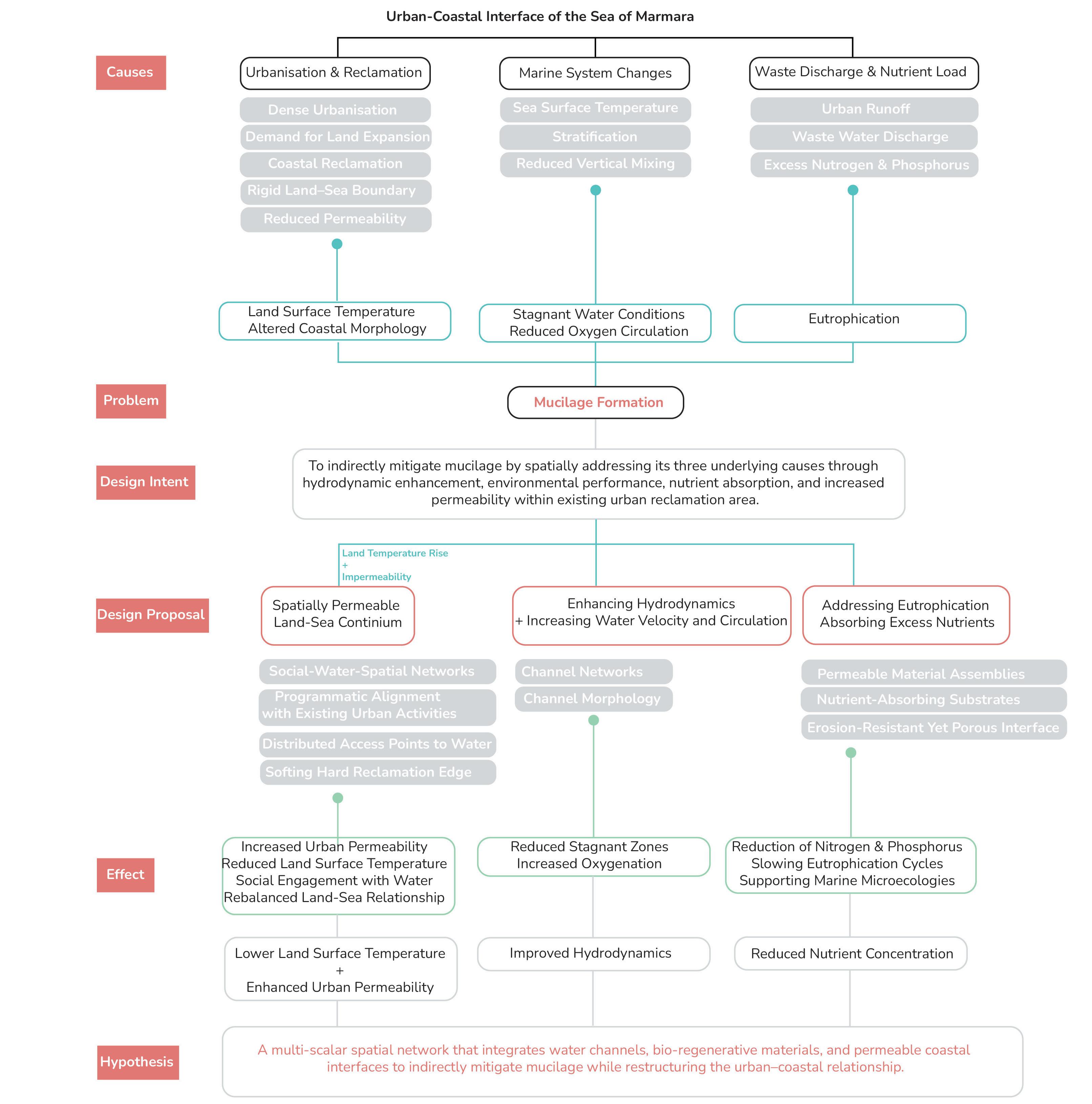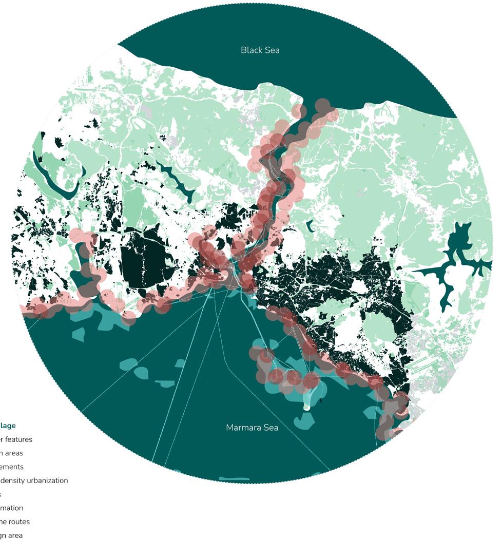 Dense urbanisation and coastal infrastructure have hardened the land–sea threshold into an impermeable boundary. What was once shaped by natural coastal flows has been transformed by infrastructure-led expansion that buries water streams, increases building density and leaves open spaces trapped and isolated. The hard reclaimed surface restricts water movement and alters sea hydrodynamics, deepening eutrophication and mucilage formation in the Sea of Marmara, while the growing urban density and impermeable reclaimed edge intensify land temperatures across the city, placing further environmental stress on the urban fabric. In addition, highways and rail lines disrupt direct access to the coastline, further distancing the city from the sea. The project rebuilds the urban–coastal gradient by softening the rigid reclaimed edge and introducing permeability across the urban–reclamation boundary, forming a coherent system of environmental and civic transitions. Building on earlier ecological design strategies, in which marine flow channels were used to restore circulation and water quality, the proposal extends this logic inland to mitigate growing heat temperature, uncover buried interfaces and reactivate a continuous spine that reconnects water, public spaces, pathways, green areas and the coastal edge.