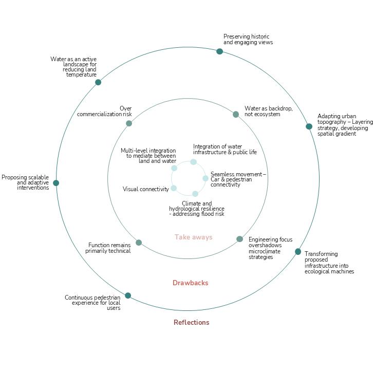 These limitations point to clear directions for further inquiry. The thesis should be viewed not as a definitive resolution but as a spatial prototype that calls for interdisciplinary collaboration. Prototyping channel geometries, validating material performance, and embedding the design within regulatory frameworks will be critical steps. Equally, studying user experience and social appropriation of reclaimed spaces can enrich the understanding of how spatial and ecological systems coexist in practice.