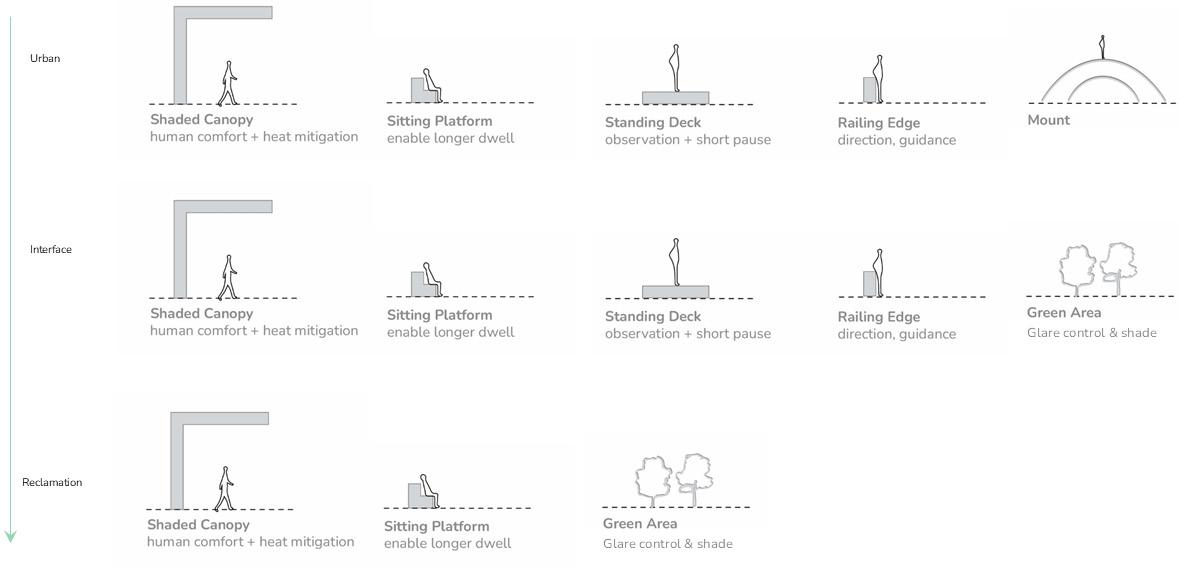 This behavioural distribution is translated into architectural form through a modular morphological catalogue. Spatial elements such as shaded canopies, sitting platforms, standing decks, and green areas are deployed in varying combinations across zones. Their placement responds to shifting behavioural needs, shading and mitigating heat in the dense urban fabric, supporting gathering and observation at the threshold, and enabling prolonged presence and sensory immersion near the coast.