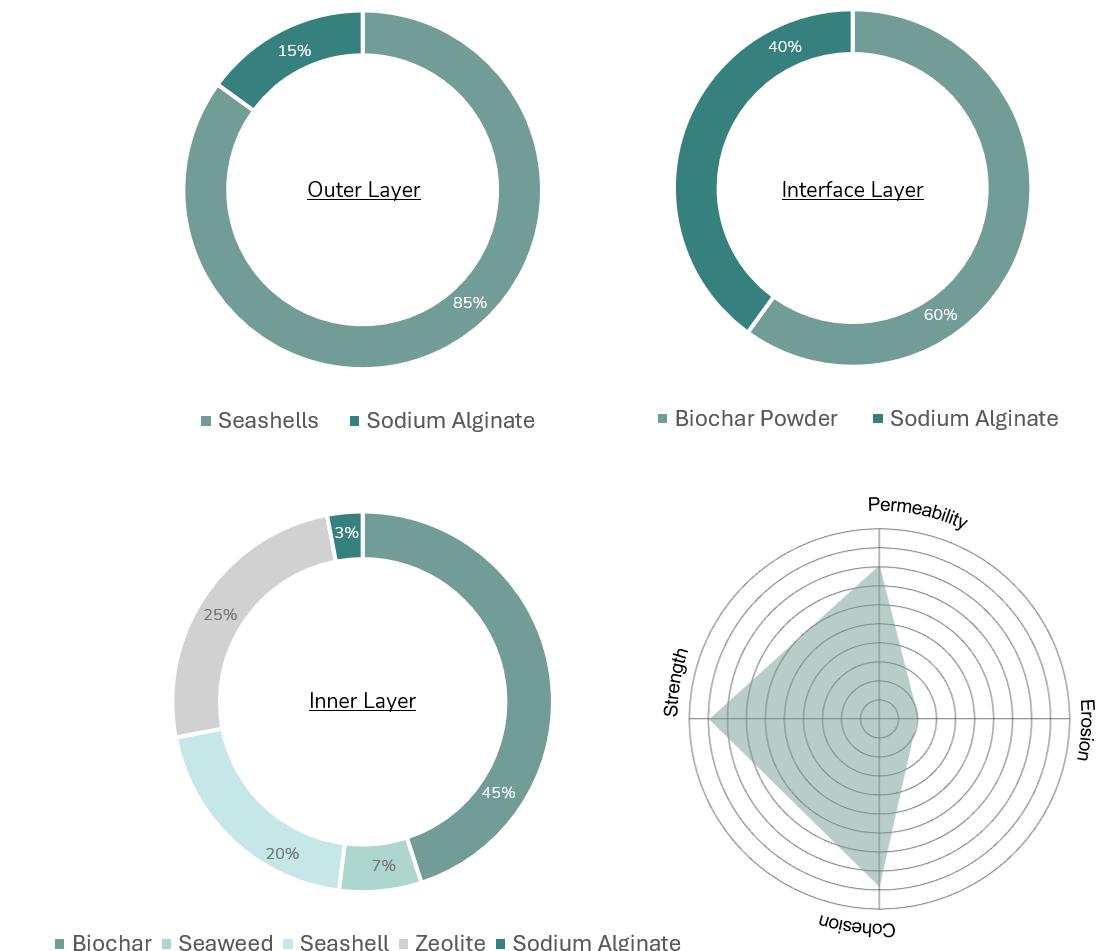 Through this iterative process, a final optimised composite was achieved. Granular seashells contributed strength and erosion resistance in the outer layer. The inner layers were biochar-dominant with trace zeolite for ammonium capture. A biochar–alginate interface ensured cohesion. Collectively, these elements produced a system with high permeability, reduced erosion, robust saline-water performance, and maintained open-pore structures for nutrient adsorption.