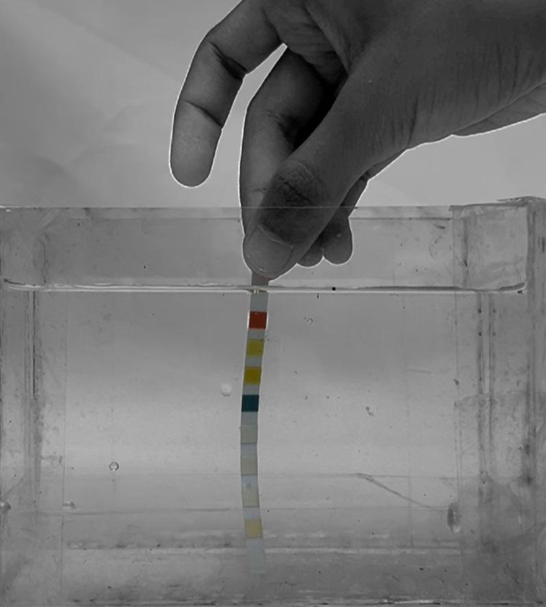 To evaluate ecological functionality, the final layered composite samples were immersed in saline water enriched with nitrogen and phosphorus compounds. Nutrient concentrations were recorded prior to immersion to establish baseline values. Following immersion, measurements were conducted using the API Freshwater Test Kit, and gradual changes in nutrient levels were observed.