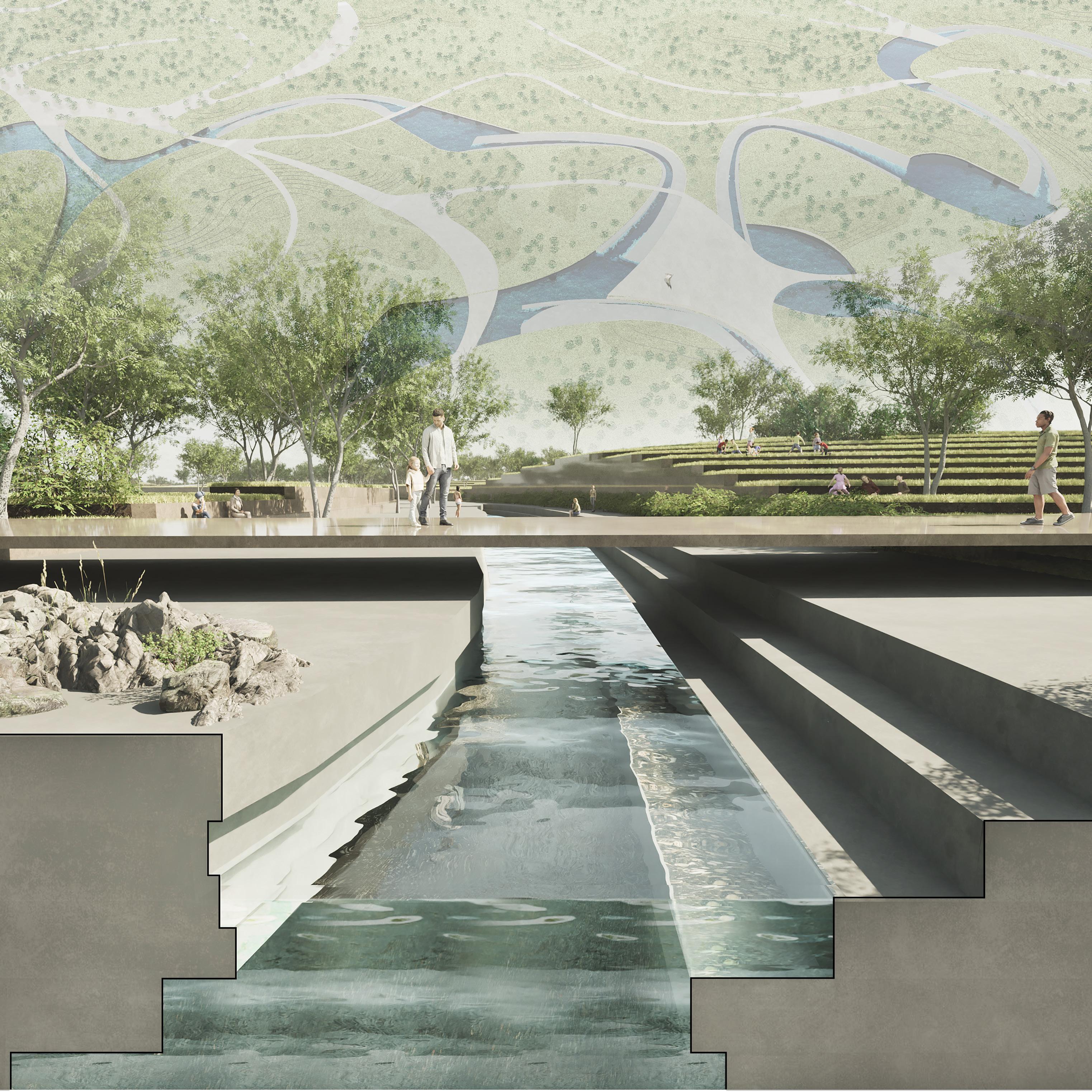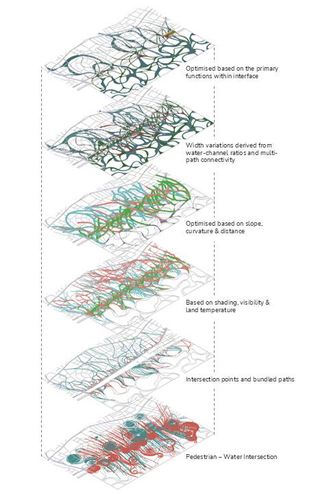 The study confirmed that experiential gradients could be created through measurable design variables such as elevation, porosity of edge conditions, and physical thresholds. These variables allowed water to support not only environmental performance but also spatial programming. The results guide the development of the pedestrian layer by ensuring that water zones aligned with circulation logic, comfort bands, and public use patterns.
