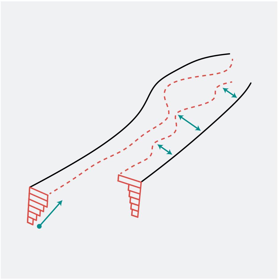 The pedestrian design is structured through a behaviour-based logic, organised around three primary movement modes: passing, standing, and staying. These modes are distributed along a spatial gradient, influenced by changing environmental parameters such as temperature, solar exposure, and proximity to water. In the urban condition, the design prioritises efficient flow and short pauses. At the interface, the system slows, enabling tactile engagement and visual access. In the reclamation zone, movement culminates in high-contact, immersive experiences with water.