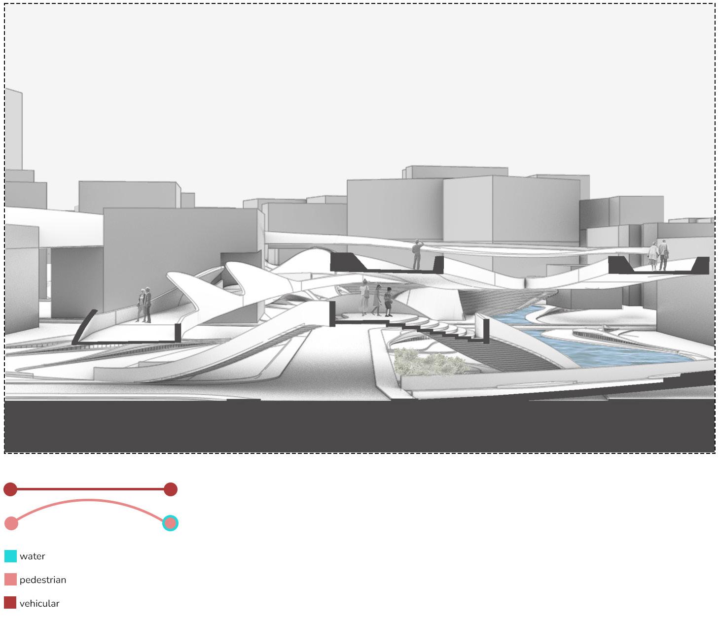 The sectional perspectives illustrate that the water, pedestrian, and vehicular systems are not simply stacked but integrated into a coherent spatial framework. These systems are organised in a vertical relationship, supporting both movement and perception. Water establishes the environmental base, regulating temperature and guiding visual continuity. Pedestrian routes are layered above, aligned with shaded areas and ventilation paths to ensure comfort and spatial clarity. Vehicular infrastructure is reconfigured through elevation, acoustic enclosures, or submersion to maintain the openness and legibility of the pedestrian and ecological environment. This organisation varies across the urban, interface, and reclamation zones. In dense areas, systems are compact to maximise efficiency and separation. Toward the coast, the composition becomes more open, encouraging interaction and spatial continuity. The sectional strategy confirms the project’s ability to mediate environmental performance and user experience through calibrated spatial logic.