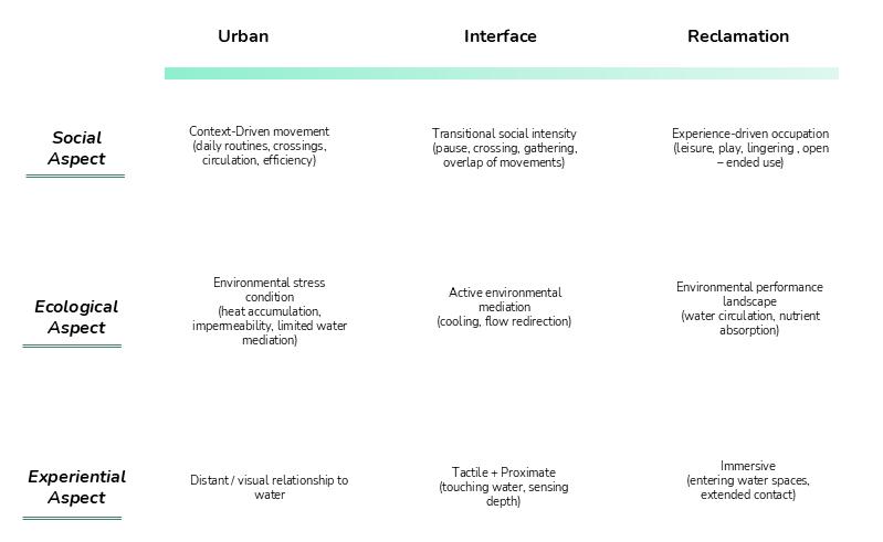 This layer establishes water as the primary element in shaping the sensory experience of the corridor. It was introduced first due to its dual role in environmental regulation and spatial legibility. The design investigation examined how different degrees of visual and physical access to water could structure user perception and behaviour across the urban, interface, and reclamation zones.