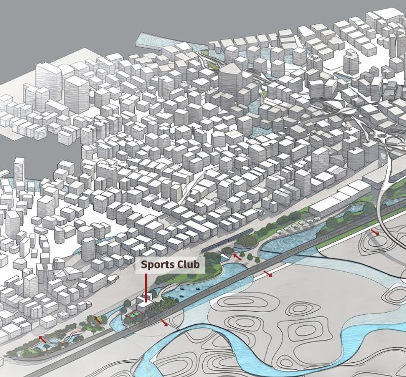 Three key nodes anchor this activation. The first is near the existing sports club, where new water-related activities such as kayaking, viewing decks, meditative spaces, jogging tracks, and cycling paths are introduced. These functions reinforce