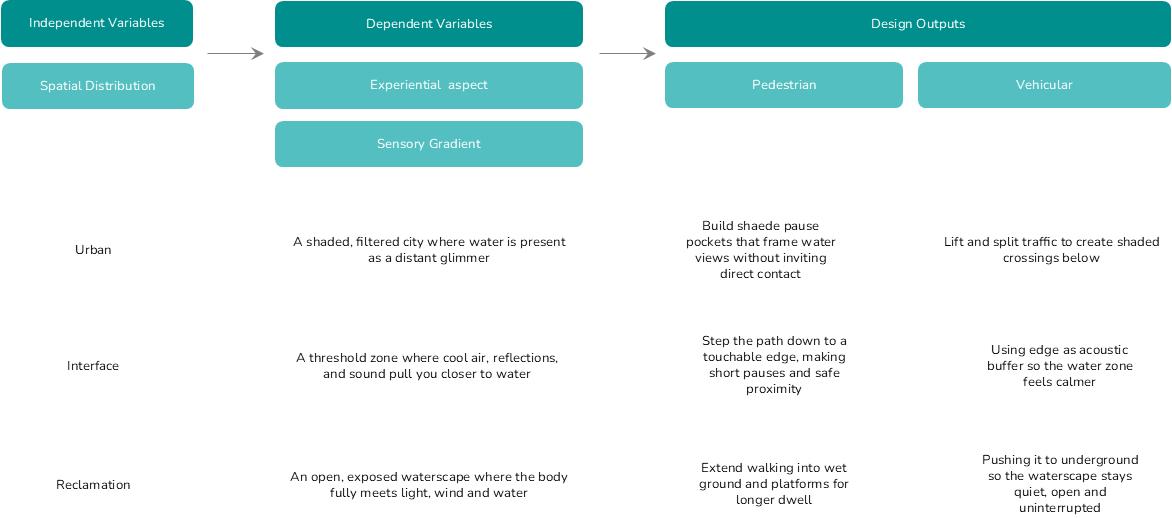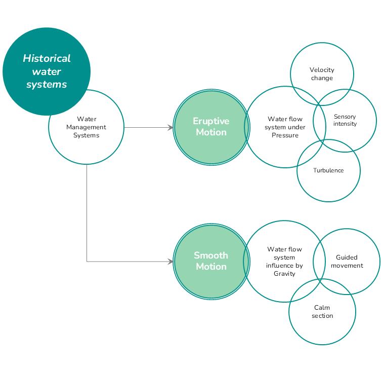 Fig. 5.18. Diagram mapping spatial variables to water-based flow regimes and design outputs. Image created by the author.