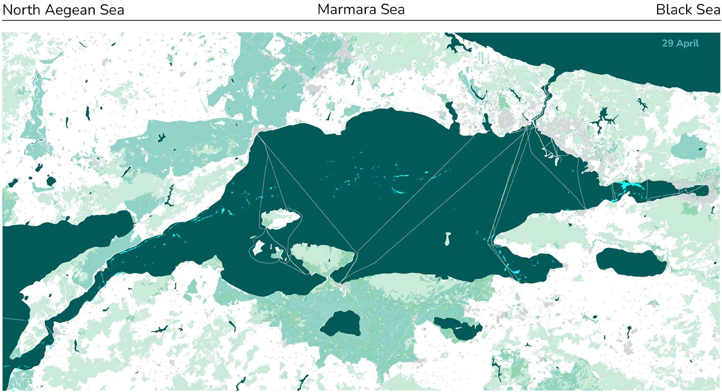 In 2021, vast blankets of marine mucilage-a thick gelatinous substance often referred to as “sea snot” covered nearly 90 per cent of the Sea of Marmara’s surface. The blooms suffocated marine life, blocked sunlight penetration, and raised public concern over potential health risks, leading to reduced interaction between urban life and coastal waters. This situation reinforced widespread concern among scientists and fishing communities regarding the sea’s declining ecological resilience. Although mucilage appears sudden, it is the outcome of long-term imbalance associated with urbanisation-driven temperature rise, which intensifies eutrophication under conditions of weakened circulation resulting from altered coastal hydrodynamics. Within a semi-enclosed sea with limited natural flushing, such pressures accumulate rapidly, accelerating ecological degradation.12