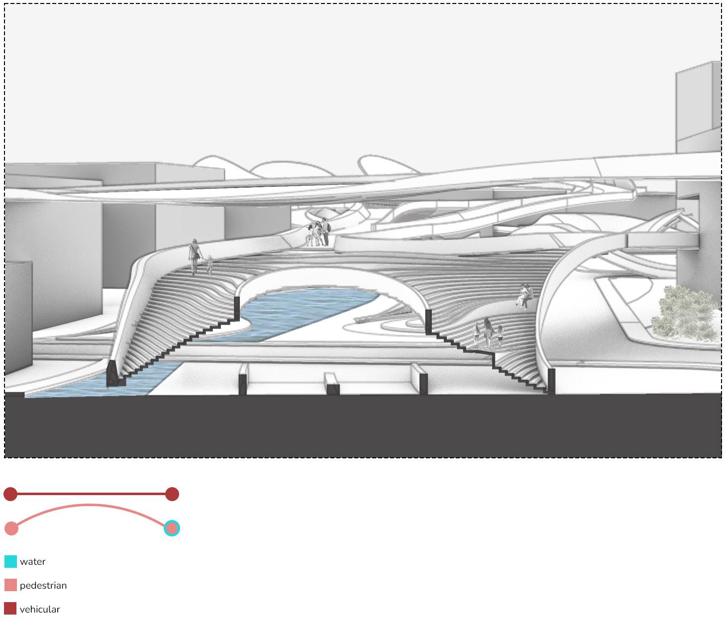 A second boundary, the coastal highway, is redefined through elevated and sunken connections that allow water and people to pass. Water access repositions the highway as a secondary bridge crossing over a primary hydrological network. These vertical transitions blur the line between land and sea, reinterpreting the interface not as an edge, but as a shared threshold. Once improved connectivity is established, the focus shifts to activating the interface with experiential programs that promote human-water interaction and socio-ecological awareness.