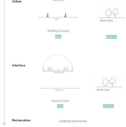 Across the three zones, the vehicular layer transitions from visible and architecturally treated in dense urban conditions to fully concealed in the coastal edge. This transformation is not merely functional but supports the larger spatial and environmental goals of the corridor by reducing surface-level interruptions and maintaining a high degree of experiential