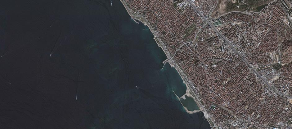 This decline cannot be explained by oceanographic processes alone. It is inseparable from the spatial and infrastructural transformation of the Marmara’s coastline. Policy responses to mucilage have been immediate but largely symptomatic. Boats were deployed to skim tonnes of mucilage from Istanbul’s harbours, yet within weeks the blooms reappeared, underscoring the limits of short-term interventions. Chemical and biological treatments have been tested, and new wastewater plants promise cleaner inflows. These measures matter, but they address effects rather than causes. The core issue is a breakdown of circulation at the urban–sea boundary. Over the past half-century, urban expansion and reclamation projects have hardened the Marmara’s edge into an impermeable boundary. Where natural shores once absorbed and diffused wave energy, large-scale reclamation has sealed the land–sea interface and replaced a living shoreline with a rigid edge that no longer supports ecological or cultural continuity.