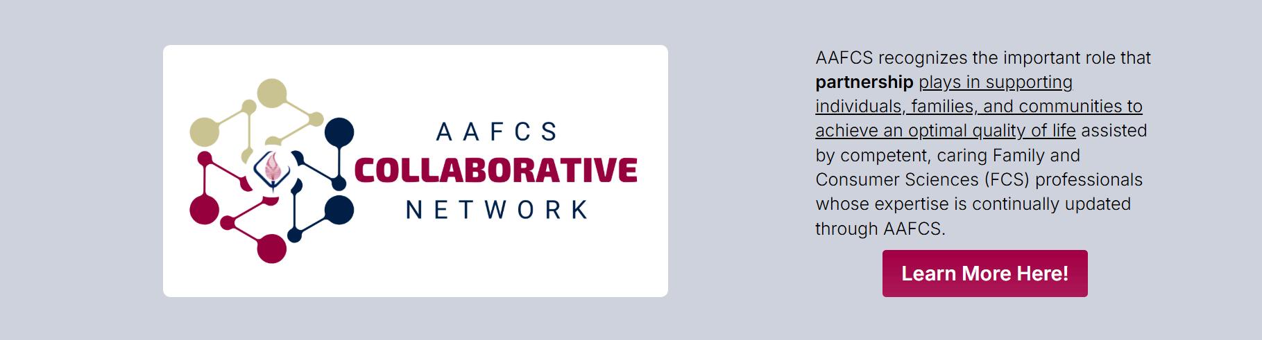 The AAFCS Collaborative Network aims to provide FCS professionals with the resources and support to advance their work in improving the lives of individuals, families, and communities.