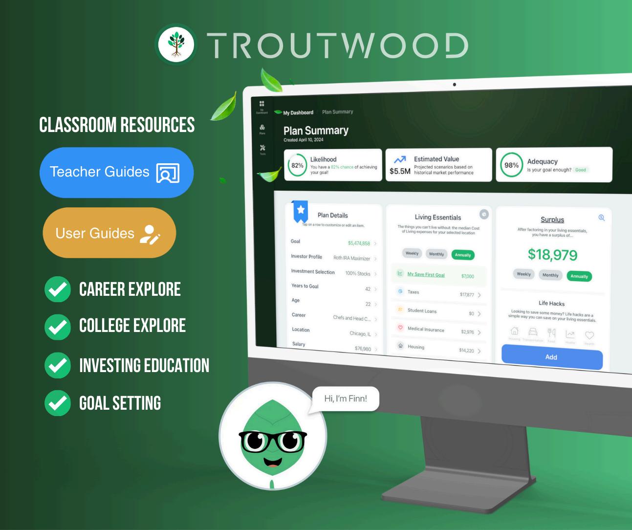 Troutwood gives educators and professionals the tools to teach real-world financial skills budgeting, investing, goal setting, and more Our platform is intuitive, engaging, and built to be used right away with teacher guides, students guides and videos. With the help of Finn, Troutwood’s interactive guide, gain the confidence to make smart money decisions that last a lifetime