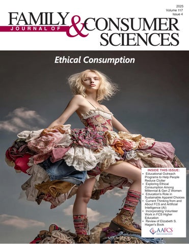The Journal of Family & Consumer Sciences: (ISSN: 1082-1651) is published four times a year (Winter, Spring, Summer, Fall) by the American Association of Family & Consumer Sciences (AAFCS), 1410 King Street, 2nd Floor, Alexandria, VA 22314. Member subscriptions are included in AAFCS membership dues of $150, effective May 1, 2016, of which $64.50 is designated for this publication. Also effective August 1, 2018, individual nonmember subscriptions are $155 (Online only, both domestic and foreign); Institutions $330 (Online only, both domestic and foreign). No discounts for multiple-year subscriptions. Periodicals postage paid at Alexandria, VA and additional mailing offices. POSTMASTER: please send address changes to Journal of Family & Consumer Sciences, AAFCS, 1410 King Street, 2nd Floor, Alexandria, VA 22314