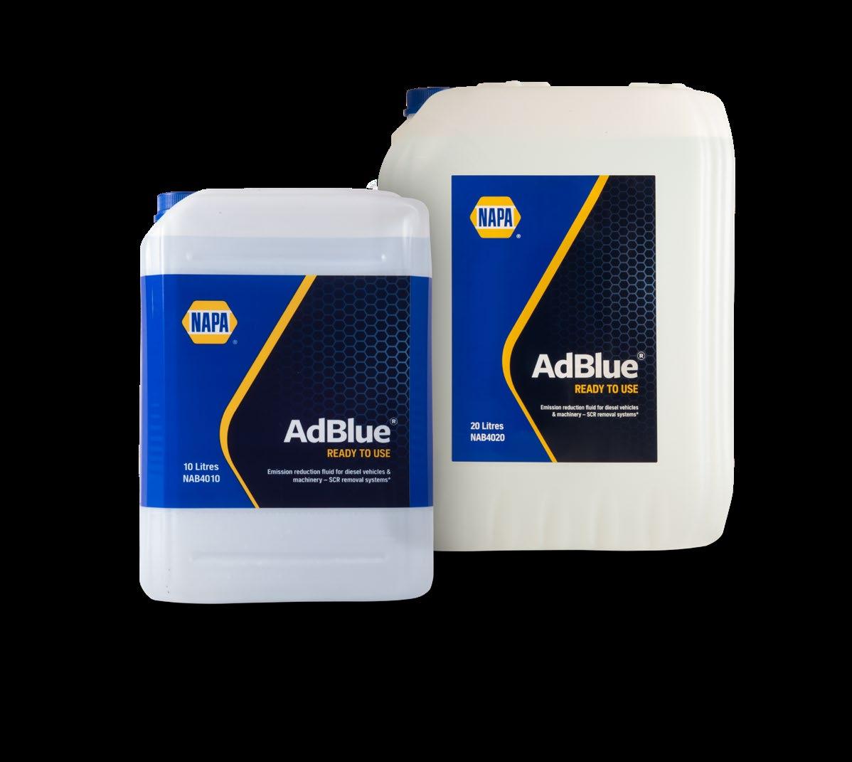 NAPA AdBlue® is sprayed into the exhaust system to reduce NOx emissions produced by diesel engines. It is available in 5L, 10L and 20L bottles with integrated pouring spouts along with 205L barrels, and is suitable for vehicles with SCR systems.