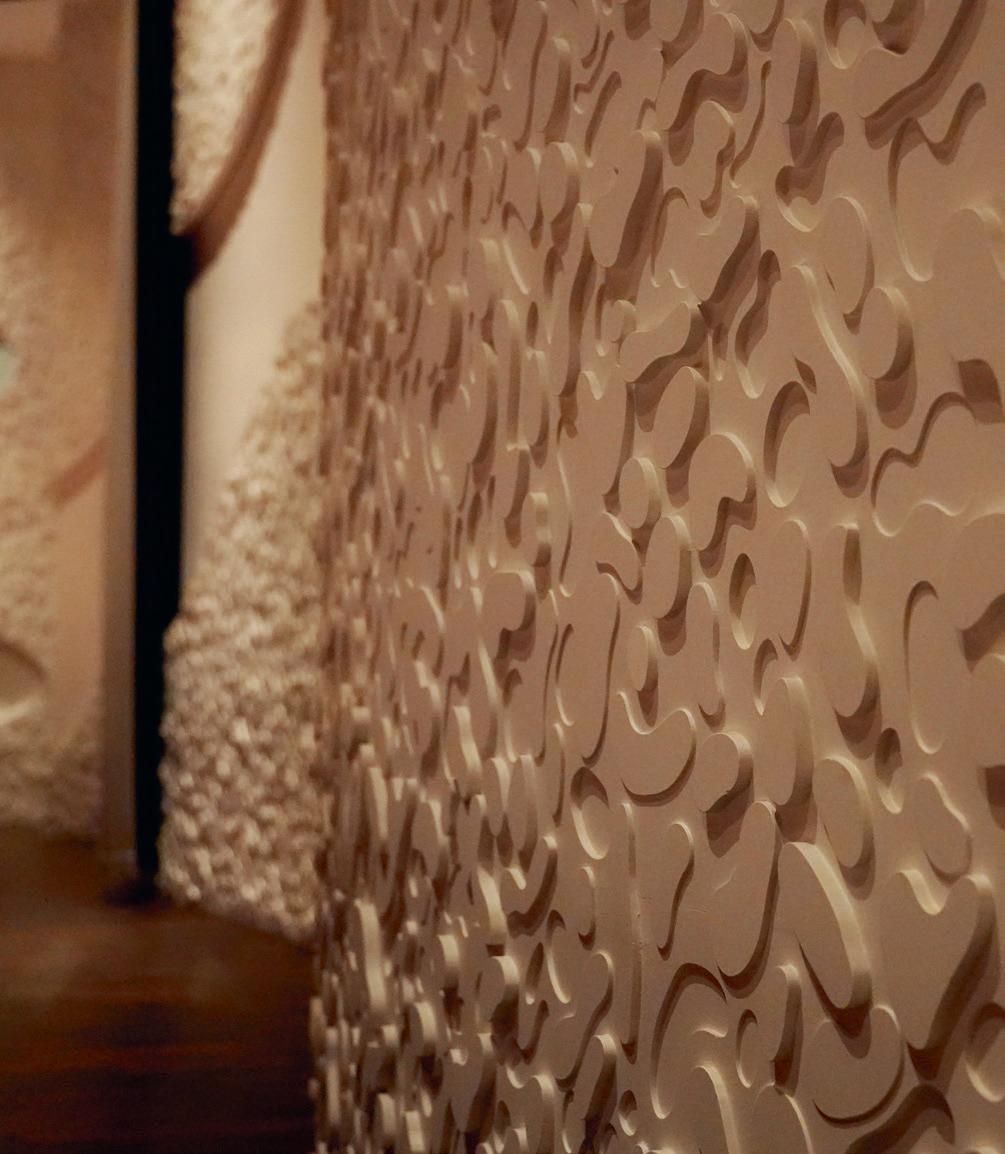 Først blev der udarbejdet et kort over væggene, som derefter blev brugt til at tegne et tredimensionelt mønster baseret på arkitektens design. Resultatet blev de særlige amøbeformer, som senere blev udskåret i en speciel gips og påført de færdige vægge. Mønstret sikrer den bedst mulige akustik, hvor lyden absorberes eller reflekteres efter nøje afstemte hensyn til den musik, der fylder salen. På væggende i Koncertsalen findes der 160.000 amøber, som er påsat i hånden.
