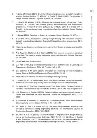 10. https://www.designcouncil.org.uk/news-opinion/design-process-what-doublediamond 11. A.-L. Fayard, I. Stigliani, & B.A. Bechky (2019), How nascent occupations construct a mandate: The case of service designers’ ethos. Administrative Science Quarterly, 62, 270-303. 12. https://www.ideo.org/approach 13. D.A. Kolb (1984), Experiential Learning: Experience as the Source of Learning and Development. Englewood Cliffs, NJ: Prentice-Hall, p. 41. 14. S.L. Beckman & M. Barry (2007), Innovation as a learning process: Embedding design thinking. California Management Review 50(1), 25–56. 15. https://dschool.stanford.edu/resources/design-thinking-bootleg 16. C. Carter (2016), Let’s stop talking about THE design process. https://medium.com/ stanford-d-school/lets-stop-talking-about-the-design-process-7446e52c13e8 17. Forrester (2018), The Total Economic Impact™ Of IBM’s Design Thinking Practice. A Forrester Total Economic Impact™ Study.; InVision (2019), The new design frontier. 18. K.D. Elsbach & I. Stigliani (2018), Design thinking and organizational culture: A review and framework for future research. Journal of Management 44(6), 2274– 2306. 19. M. Stickdorn, M. Hormes, A. Lawrence & A. Schneider (2018), This is service design doing: applying service design thinking in the real world. 20. J.L. Hess, N. Fila & S. Purzer (2015), The relationship between empathic and innovative tendencies among engineering students. The International Journal of Engineering Education, 32(3), 1236-1249. 21. J.L. Hess & N.D Fila (2016), The manifestation of empathy within design: findings from a service-learning course. CoDesign, 12(1–2), 93–111; J.L. Hess, J. Strobel & A.O. Brightman (2017), The development of empathic perspective-taking in an engineering ethics course. Journal of Engineering Education, 106(4), 534-563.