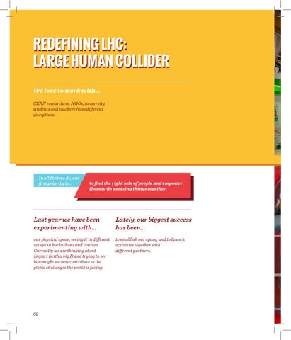 REDEFINING LHC: LARGE HUMAN COLLIDER We love to work with… CERN researchers, NGOs, university students and teachers from different disciplines.