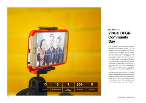 Virtual DFGN Community Day One of the projects that emerged from the IDFW 2019 was the idea of a DF Day to be organized at all design factories on the same day worldwide. Due to mobility restrictions and most universities moving their lessons online, the DFGN team decided to pivot the idea and organize a fully digital event called the virtual DFGN Community Day. The programme offered something for everyone, ranging from a virtual pub quiz with the DF New Zealand (GMT+12) to a co - creation workshop organized by the New York City DF (GMT-4).
