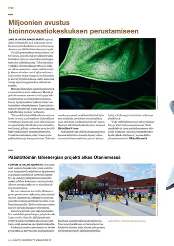 Miljoonien avustus bioinnovaatiokeskuksen perustamiseen Aalto-yliopistolle 10,5 miljoonaa euroa bioinnovaatiokeskuksen perustamiseen. Avustus on säätiön historian suurimpia. Varoilla perustetaan monialainen tohtorikoulu, jossa biotaloutta lähestytään tekniikan, taiteen, muotoilun ja kauppatieteiden näkökulmasta. Tohtorikoulun vetäjäksi rekrytoidaan professori, jolla on vahva osaaminen materiaalitieteestä ja kiertotaloudesta sekä kyky verkostoitua luovien alojen osaajien, teollisuuden ja kasvuyritysten kanssa. Aalto panostaa varoja myös huippuluokan infrastruktuuriin. Metsäteollisuuden osuus Suomen tavaraviennistä on noin viidennes. Metsä- ja peltobiomassan arvo voitaisiin jopa kaksinkertaistaa vuoteen 2050 mennessä, kun se hyödynnetään korkean lisäarvon tuotteiden valmistuksessa. Paperinkulutuksen vähentyessä puuta myös vapautuu käytettäväksi muihin tuotteisiin. ”Esimerkiksi tekstiilikuidusta saatava hinta on noin 2,5-kertainen liukoselluun verrattuna. Suomessa voisi olla biomateriaaleja hyödyntävä kukoistava tekstiiliteollisuus, jolloin tuotteiden arvo ja työllisyysvaikutukset moninkertaistuvat. Uusia biomateriaaleja tarvitaan myös pakkauksissa ja komposiiteissa. Tulevai-