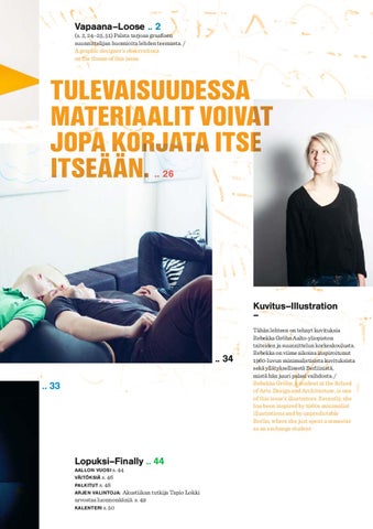 Tähän lehteen on tehnyt kuvituksia Rebekka Gröhn Aalto-yliopiston taiteiden ja suunnittelun korkeakoulusta. Rebekka on viime aikoina inspiroitunut 1960-luvun minimalistisista kuvituksista sekä yllätyksellisestä Berliinistä, mistä hän juuri palasi vaihdosta. / Rebekka Gröhn, a student at the School of Arts, Design and Architecture, is one of this issue’s illustrators. Recently, she has been inspired by 1960s minimalist illustrations and by unpredictable Berlin, where she just spent a semester as an exchange student