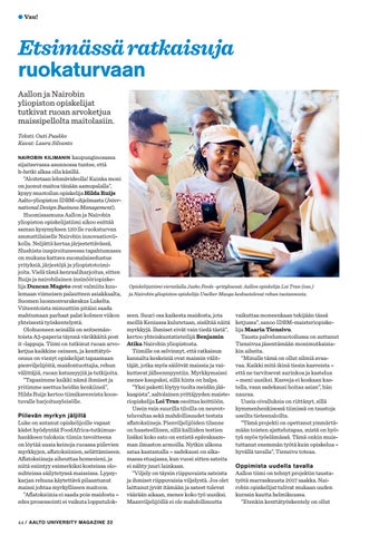 Etsimässä ratkaisuja ruokaturvaan Aallon ja Nairobin yliopiston opiskelijat tutkivat ruoan arvoketjua maissipellolta maitolasiin. Teksti: Outi Puukko Kuvat: Laura Silvanto NAIROBIN KILIMANIN kaupunginosassa sijaitsevassa asunnossa tuntee, että h-hetki alkaa olla käsillä. ”Aloitetaan lehmävideolla! Kuinka moni on juonut maitoa tänään aamupalalla”, kysyy muotoilun opiskelija Hilda Ruijs Aalto-yliopiston IDBM-ohjelmasta (International Design Business Management). Huomisaamuna Aallon ja Nairobin yliopiston opiskelijatiimi aikoo esittää saman kysymyksen 120:lle ruokaturvan ammattilaiselle Nairobin innovaatioviikolla. Neljättä kertaa järjestettävässä, Slushista inspiroituneessa tapahtumassa on mukana kattava suomalaisedustus yrityksiä, järjestöjä ja yliopistotoimijoita. Vielä tämä kenraaliharjoitus, sitten Ruijs ja nairobilainen insinööriopiskelija Duncan Mageto ovat valmiita kuulemaan viimeisen palautteen asiakkaalta, Suomen luonnonvarakeskus Lukelta. Viiteentoista minuuttiin pitäisi saada mahtumaan parhaat palat kolmen viikon yhteisestä työskentelystä. Olohuoneen seinällä on seitsemäntoista A3-paperia täynnä värikkäitä post it -lappuja. Tiimi on tutkinut ruoan arvoketjua kaikkine osineen, ja kenttätyöosuus on vienyt opiskelijat tapaamaan pienviljelijöitä, maidontuottajia, rehun välittäjiä, ruoan katumyyjiä ja tutkijoita. ”Tapasimme kaikki nämä ihmiset ja yritimme asettua heidän kenkiinsä”, Hilda Ruijs kertoo tiimikavereista koostuvalle harjoitusyleisölle.