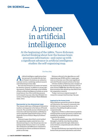 rtificial intelligence applications have become part of everyday life also here in Finland. AI solutions are utilised in customer service, marketing, medical research and industrial processes alike. But each step forward in AI needs to be backed by extensive research. In addition to strong ongoing research, Finland’s advantage in the building of better artificial intelligences includes an exceptional history. One of the world’s key pioneers in AI research was none other than Helsinki University of Technology Professor Teuvo Kohonen (1934–2021). Represented as two-dimensional maps The January 1982 issue of Biological Cybernetics marked a turning point in the history of Finnish research. The scientific journal, which focuses on research in self-steering systems, published an article titled Self-Organized Formation of Topologically Correct Feature Maps by Professor Kohonen. Kohonen’s paper described a novel method for organising complex material into a twodimensional map in a way that groups sets containing similar features close to one another. The similarities and differences contained in the material are shown as distances between points on the map. 44 / AALTO UNIVERSITY MAGAZINE 30
