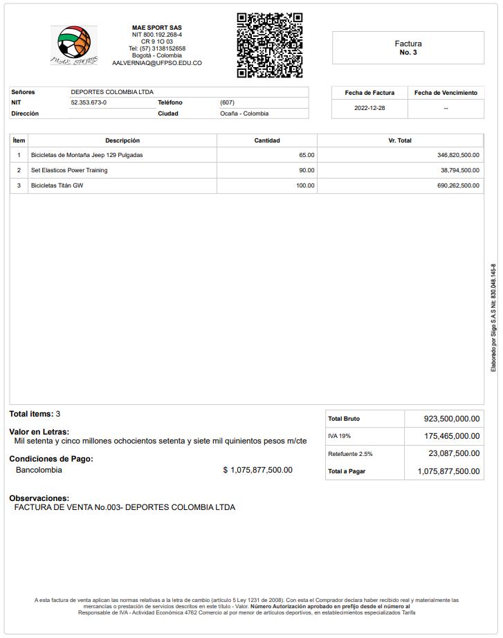 DICIEMBRE 28. La empresa vende al contado valor que es consignado directamente en BancolombiaaDEPORTESCOLOMBIA LTDA,segúnFacturadeVentaNo__003 , los siguientes elementos: