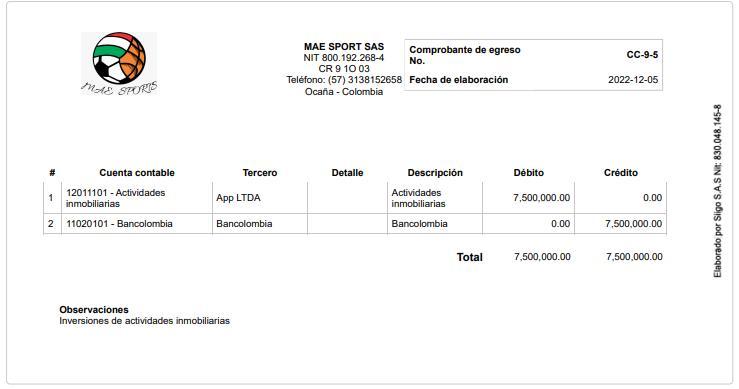 CONCEPTO: INVERSIONES DE INMOBILIARIA EN LA EMPRESA APP LTDA PÁGUESE A LA ORDEN DE: _____App LTDA__ A FAVOR DE: App LTDA LA SUMA DE: ___SIETE MILLONES QUINIENTOS MIL PESOS Saldo anterior Consignación Suma este cheque Saldo que pasa MAE SPORT SAS FIRMA Y SELLO