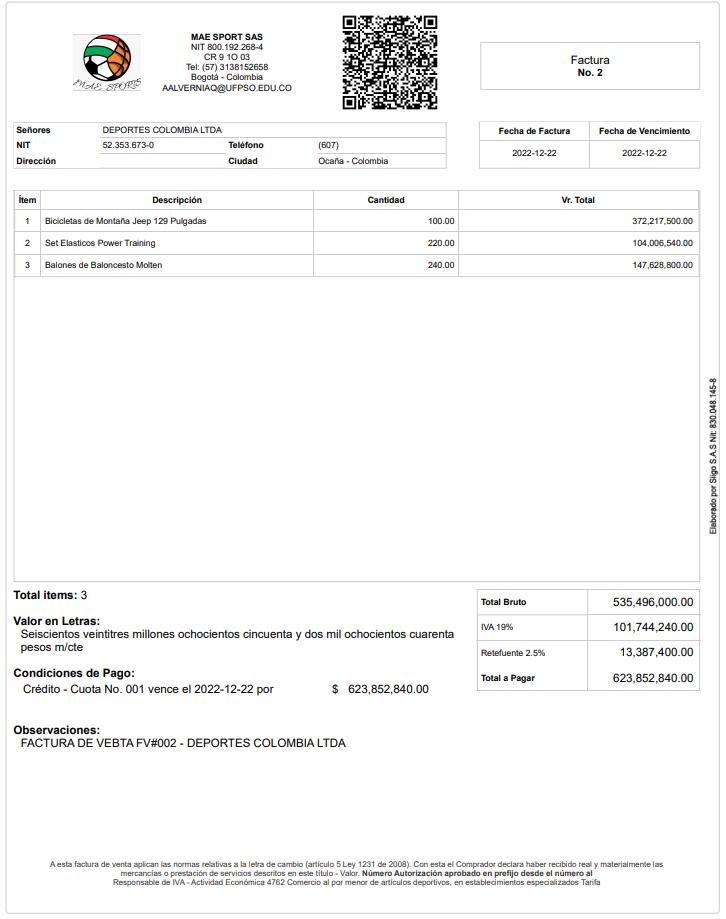 DICIEMBRE 22 La empresa vende mercancías a crédito a DEPORTES COLOMBIA LTDA con IVA 19% RF 2.5% según Factura 002