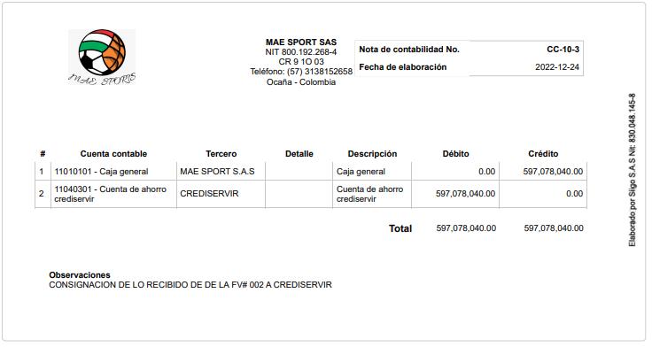 DICIEMBRE 24 La empresa consigna en Crediservir lo recibido de DEPORTES COLOMBIA LTDA, según recibo de consignación y Nota de Contabilidad No 002