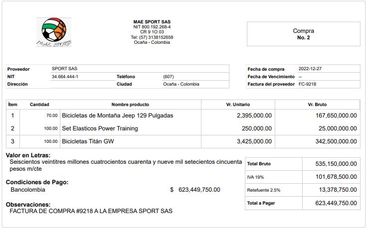 CONTADURIA DICIEMBRE 27 La empresa compra al contado mediante cheque No __008__ del Banco Colombia y CE_008 a SPORT SAS, según Factura No. 9218, los siguientes elementos: ➢ 70 Bicicletas de Montaña Jeep 129 pulgadas a $2.395.000 c/u ➢ 100 Set de Elásticos Power Training a $250.000 c/u ➢ 100 Bicicletas Titán GW a $3.425.000 c/u ➢ La mercancía se encuentra gravada con IVA 19%, RF_______%. CUENTA No. 780915-09066 CHEQUE No.008 CHEQUE No. 008 CUENTA No. 780915-09066 FECHA:27/12/2022 FECHA:27/12/2022 623.449.750 CONCEPTO: CANCELACION DE FC.9218 PÁGUESE A LA ORDEN DE: _____SPORT SAS A FAVOR DE: SPORT SAS LA SUMA DE: _seiscientos veinte y tres millones cuatrocientos cuarenta y nueve mil Saldo anterior _setecientos cincuenta ___pesos_ Consignación Suma este cheque Saldo que pasa MAE SPORT SAS FIRMA Y SELLO