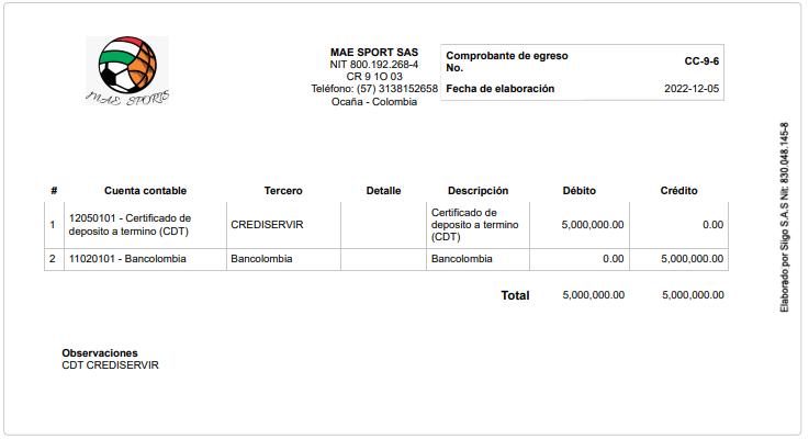 DICIEMBRE 5. Se adquiere un CDT en Crediservir por $5.000.000, girando cheque del Banco Colombia CE_005__, CH____005___.