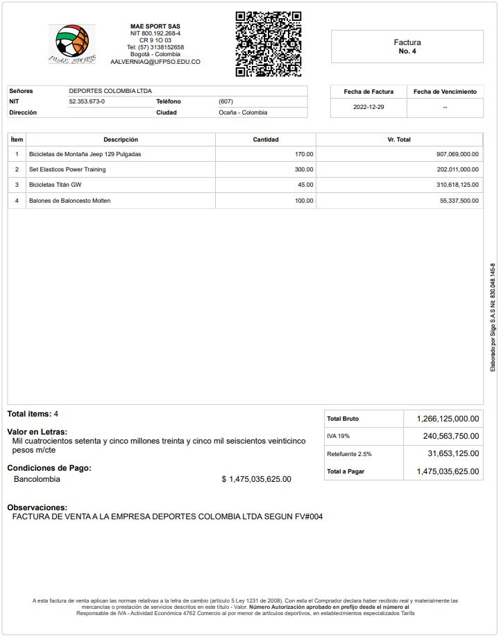 DICIEMBRE 29. La empresa vende al contado valor que es consignado directamente en Bancolombia a DEPORTES COLOMBIA LTDA, según Factura de Venta No 004 , los siguientes elementos: