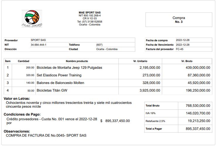 DICIEMBRE 28, La empresa compra a SPORT SAS, según Factura No. 0045 IVA 19% RF 2.5% según FC 9096, a crédito.