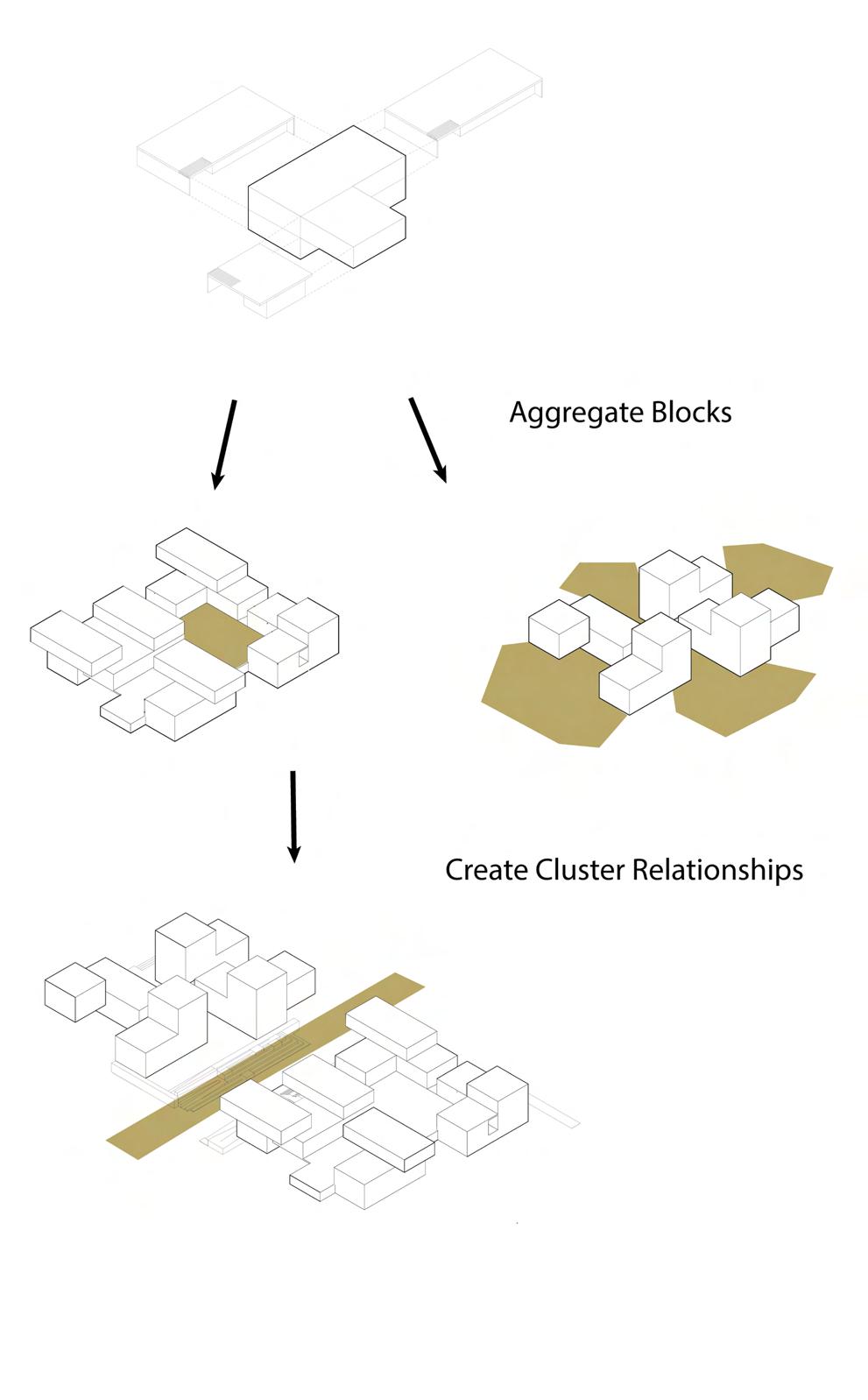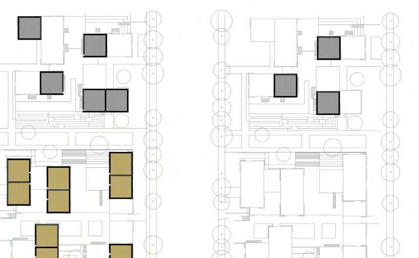 A housing development designed to bring together two diverse communities: live/work and intergenerational families. The cluster is divided into two social hubs connected by a linear courtyard, providing space for socialization and circulation. To accommodate parking, the intergenerational subunit’s central courtyard is raised to create an underground garage, providing a private raised courtyard for families. The live/ work subunit also raises its central courtyard, extending the landscape into the site and reducing the building’s footprint. The development’s massing is based on an original Mar Vista h ome, stacked and divided into multiple dwellings. This organization allows the project to be replicated in any part of the neighborhood. Overall, the design integrates the development into the Mar Vista neighborhood while providing a useful amenity for residents and creating private and public spaces for socialization and relaxation.