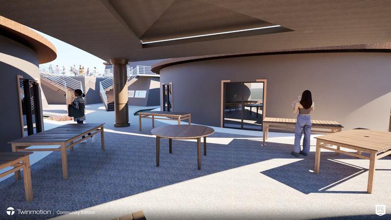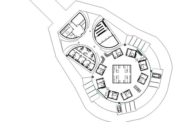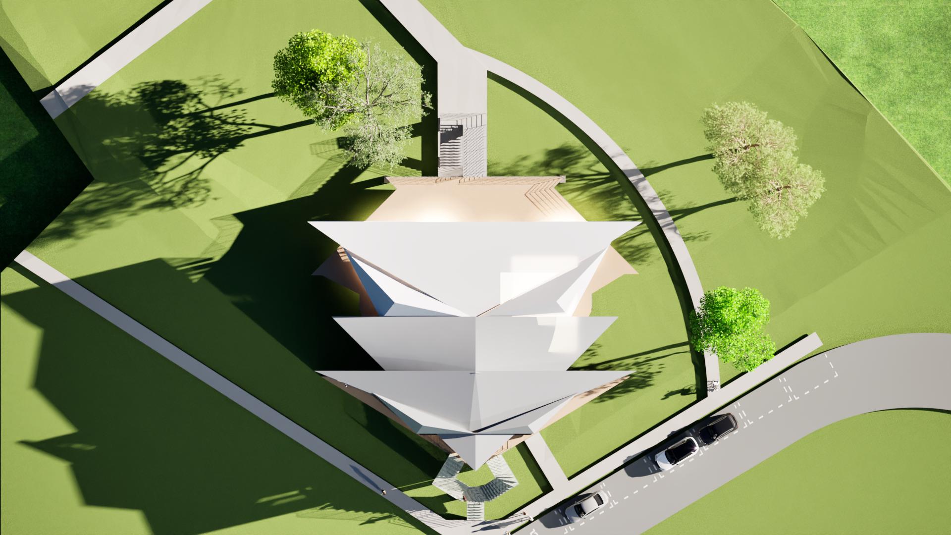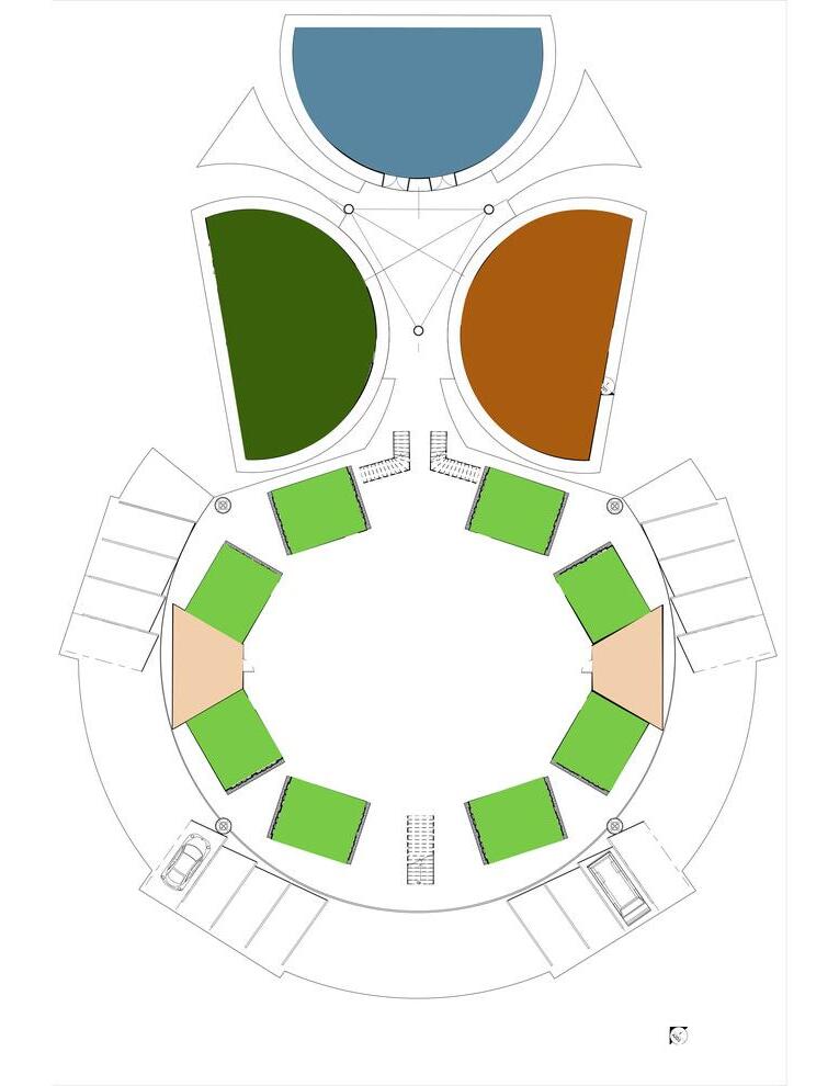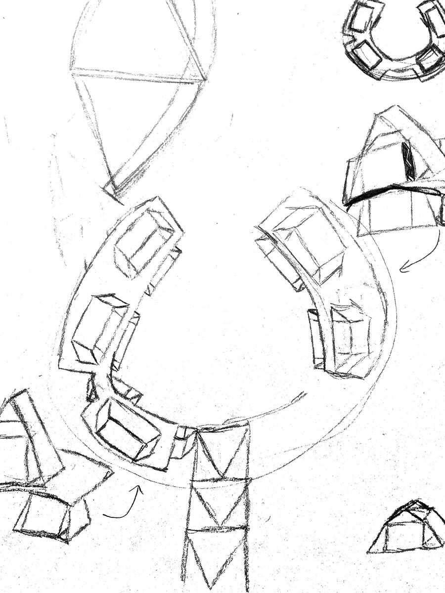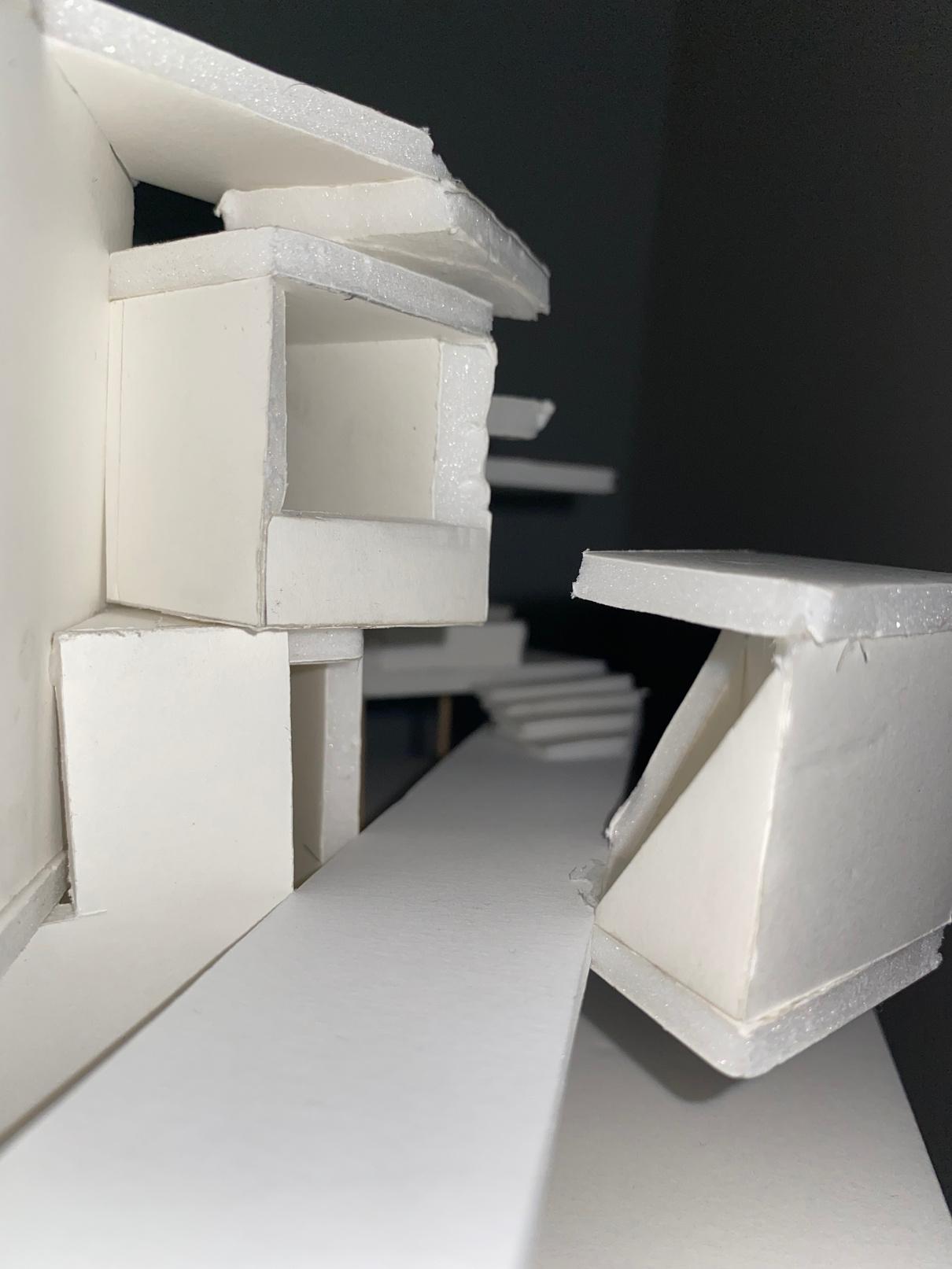 Thespiralstairwaywasusedtoinspirepartof thepathwayofthefinalstructure.Theclustered structurewasusedasareferencetounderstand howdifferentshapedstructurescanfittogether