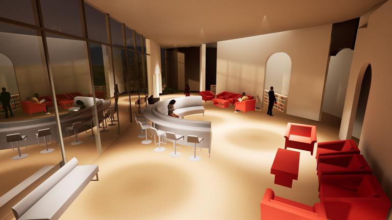Throughtheuseofnarrowviews,indirectlightis allowedtoshineallthroughthebusfromdifferent angles.Intothethereadingspaces,nooks,andshelve areas.