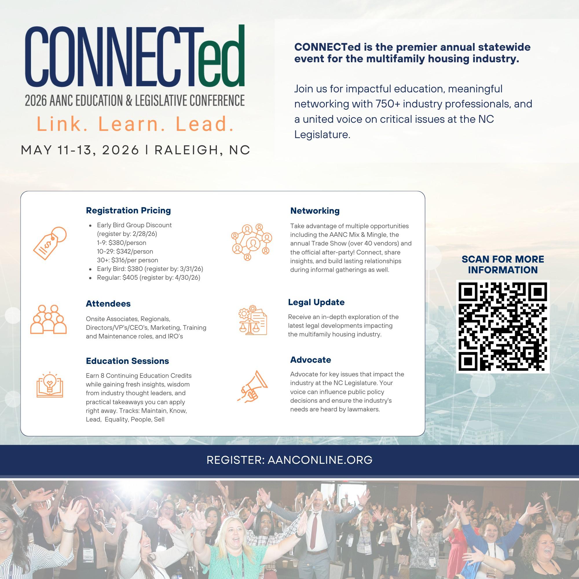 On Wednesday, May 13, AANC will host our inaugural Rental Housing Developer Day. This targeted experience is built specifically for developers, project managers, and development leaders. Focused sessions will bring together code officials and utility partners for real conversations about the issues shaping rental housing in North Carolina. Registration is available for the Developer Day as a standalone event or as an add-on to the full CONNECTed Conference. Space is limited, so I encourage you to take a look at the schedule and register today.