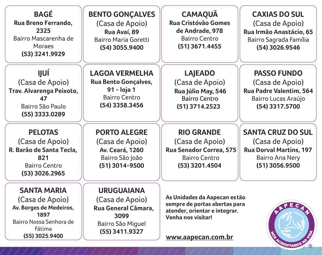 Atualmente com 14 Unidades no Rio Grande do Sul, sendo 11 Casas de Apoio, a Associação oferece atendimentos sociais e psicológicos para pessoas com Câncer, em situação de vulnerabilidade social.