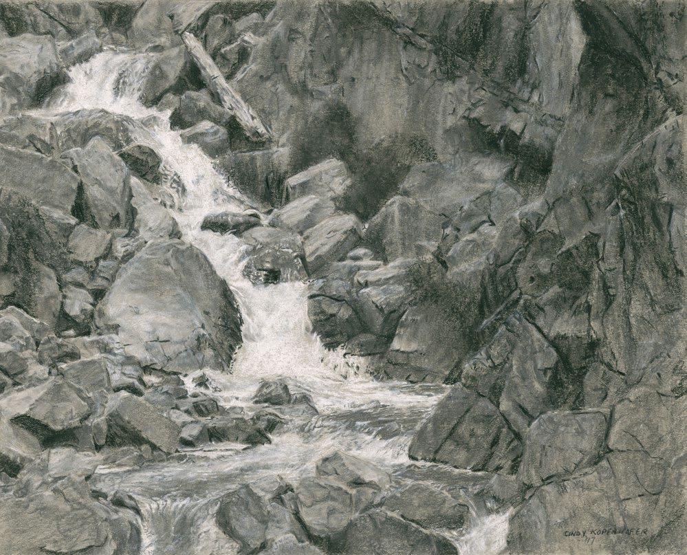 Cindy Kopenhafer, “Rushing through the Tunnels” Graphite and white charcoal on toned paper, 8x10 $800