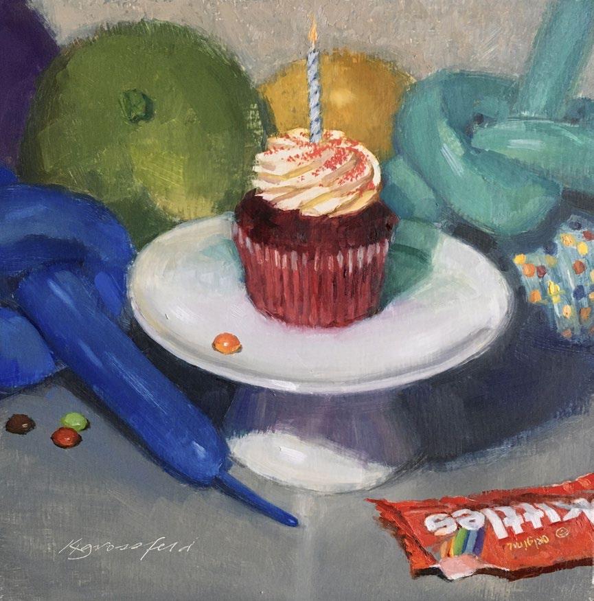Katherine Grossfeld, “Now It’s a Party!” Oil on linen, 8x8 $450