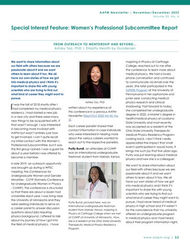 This issue contains several reports reflecting on the AAPM Annual Meeting, including a summary of student events and a recap of the 2025 Early Career Investigator Symposium. Chair of the Board of Directors Todd Pawlicki reviews key highlights from his tenure and the newly approved Strategic Plan, which outlines the future direction of AAPM. The Special Interest Group for this issue is the Women’s Professional Subcommittee, with reports including a recap of the WPSC Luncheon held at the Annual Meeting and an uplifting feature on the benefits of outreach. Other reports in this issue include a second interview with an experienced international trainer, Caridad Borrás, and a report on AAPM member Jatinder Palta who received the ASTRO Gold Medal this year!
