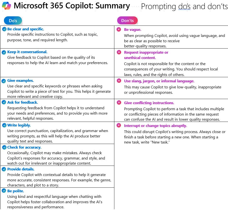 The key to successful results from Microsoft 365 Copilots is mastering prompting. On the next page is a handy chart from Microsoft for Copilot Prompting do’s and don’ts.